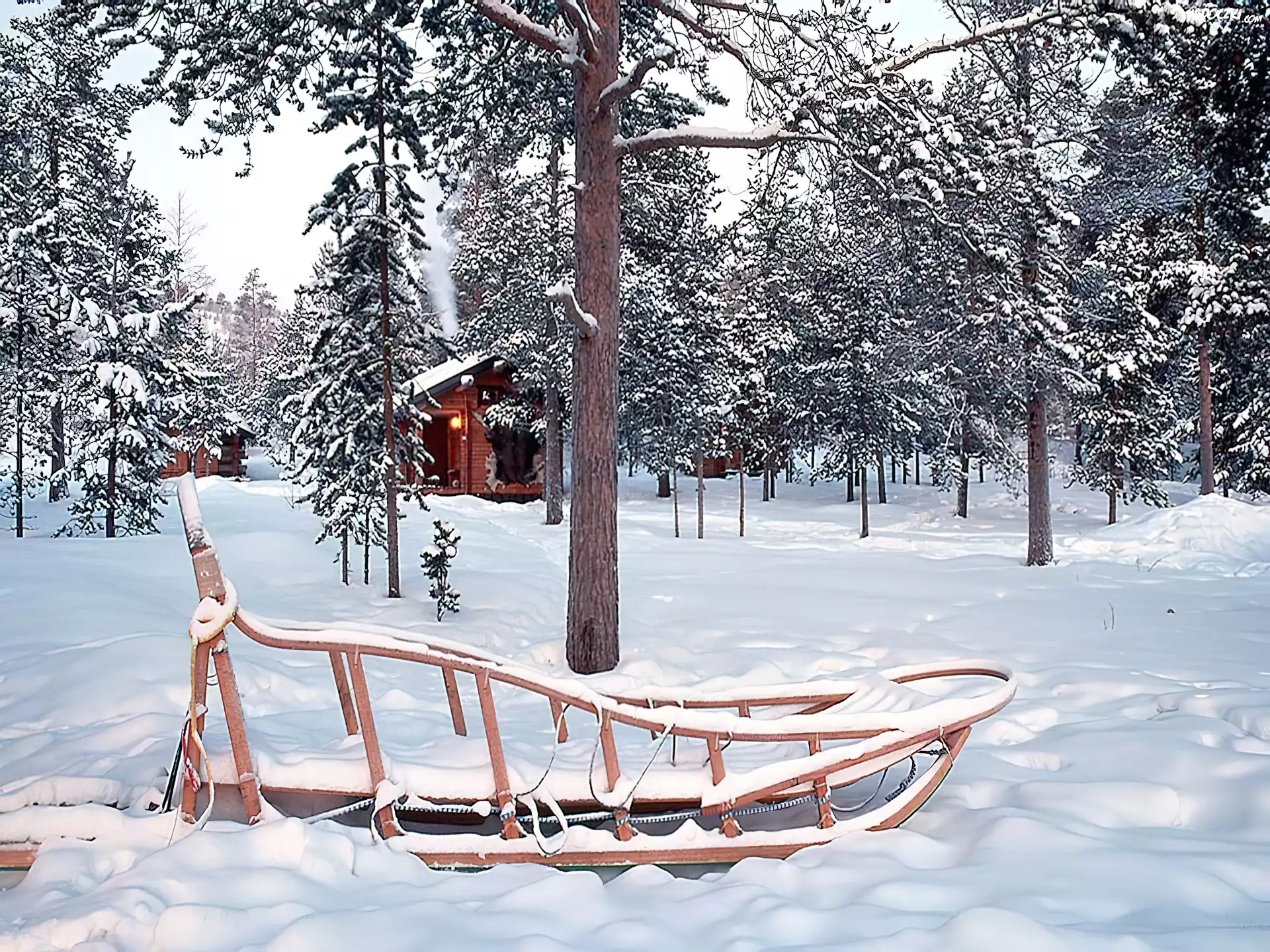 Zima, Domek, W, Lesie, Sanki
