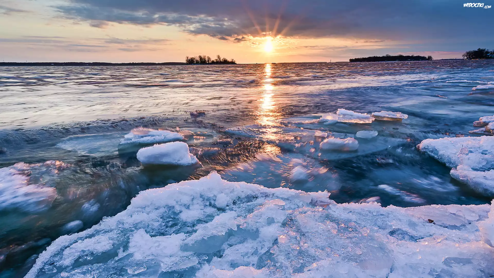 Jezioro, Zima, Lód, Zachód Słońca