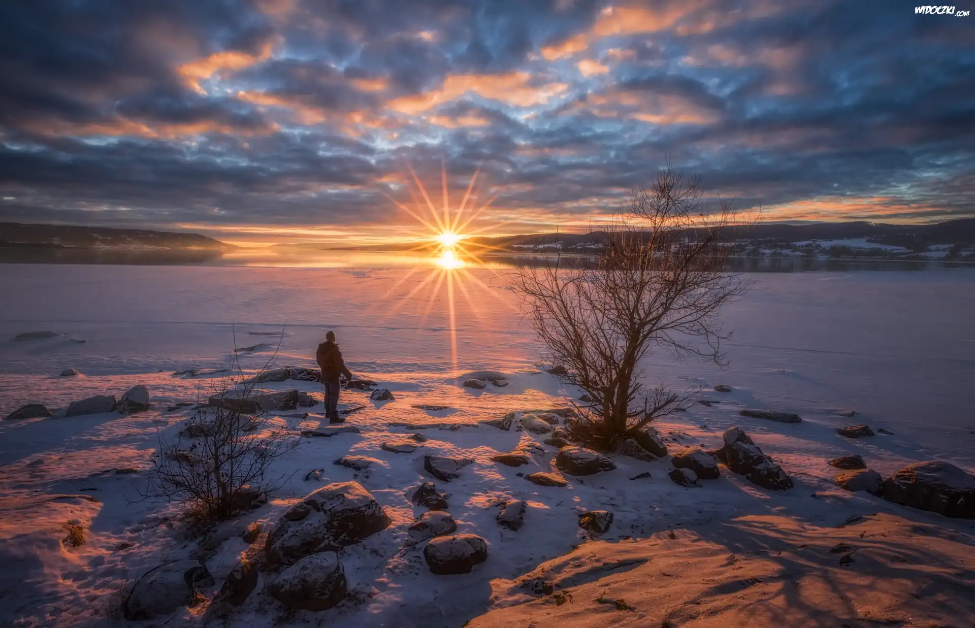 Zdjęcia, Norwegia, Zima, Jezioro Tyrifjorden, Drzewo, Promienie słońca, Mężczyzna