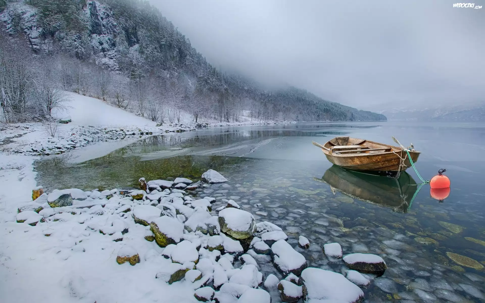 Zdjęcia, Zima, Jezioro, Kamienie, Łódka, Mgła, Drzewa