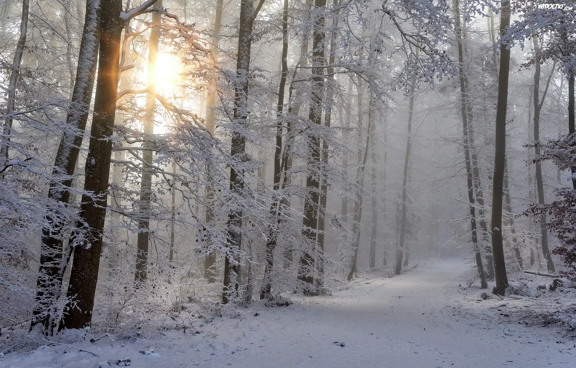 Zdjęcia, Zima, Drzewa, Las, Śnieg, Mgła, Słońce