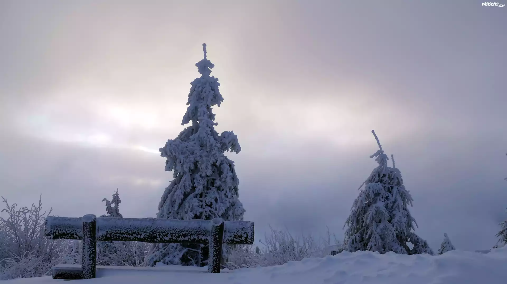 Zdjęcia, Zima, Świerki, Mgła, Ławka
