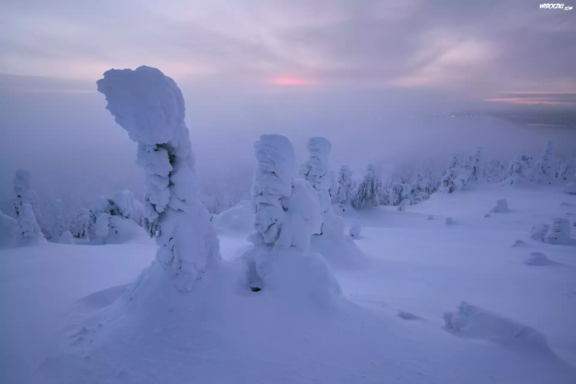 Zdjęcia, Zima, Góry, Zaśnieżone, Drzewa, Mgła, Finlandia