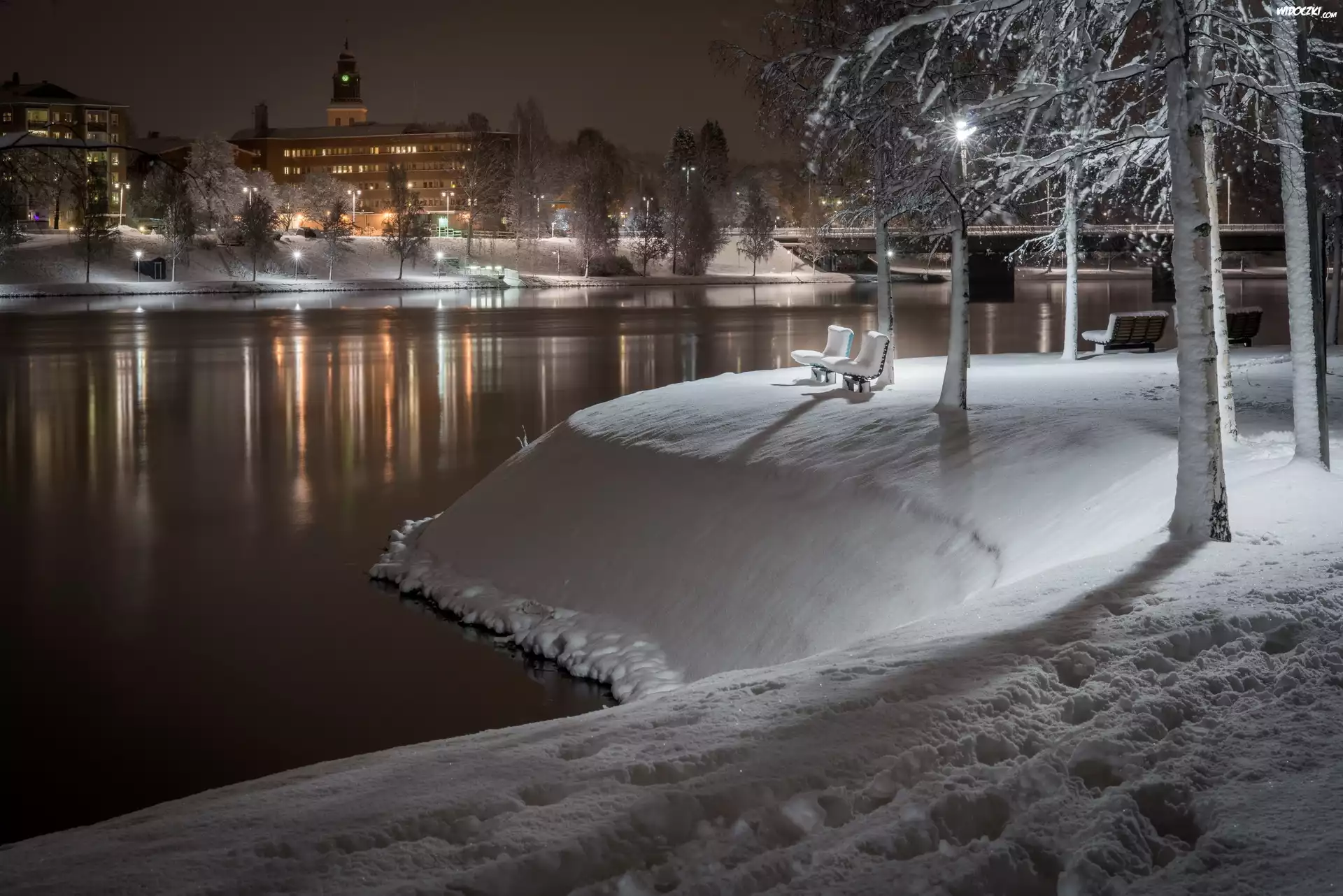Zdjęcia, Zima, Park, Ławeczki, Miasto, Noc