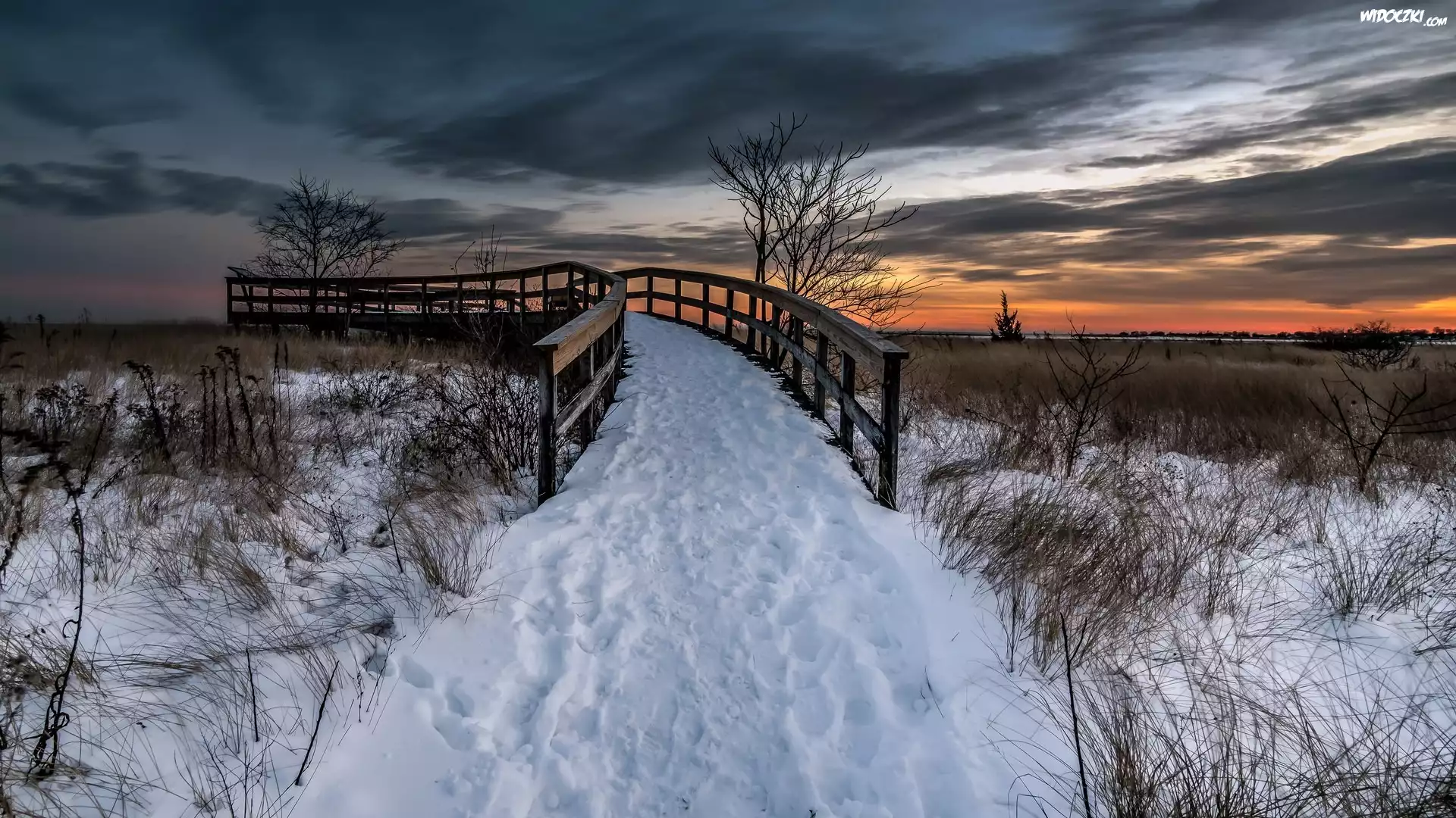 Zdjęcia, Zima, Zachód słońca, Drewniany, Most, Drzewa
