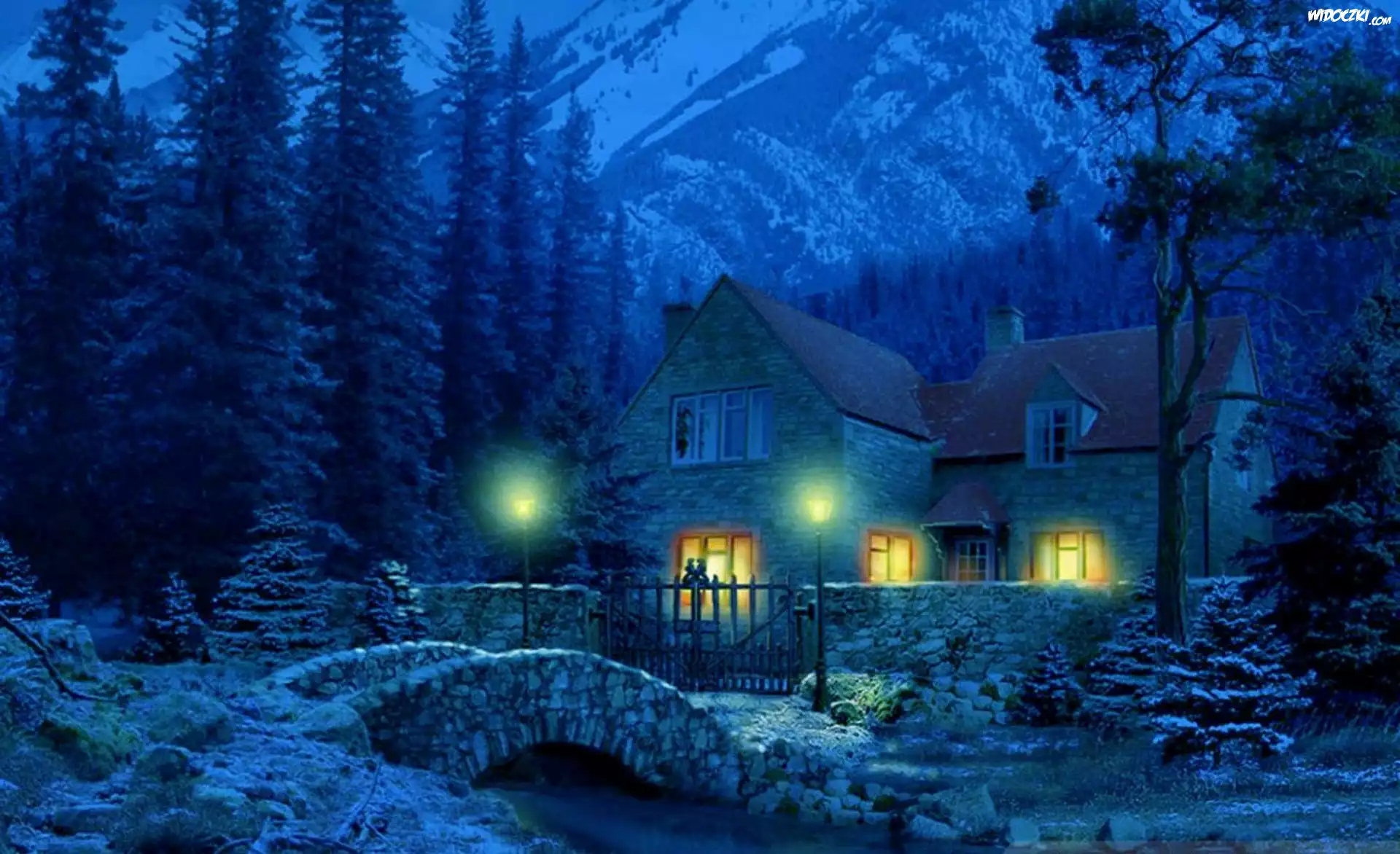 Zdjęcia, Zima, Oświetlony, Domek, Mostek, Strumyk
