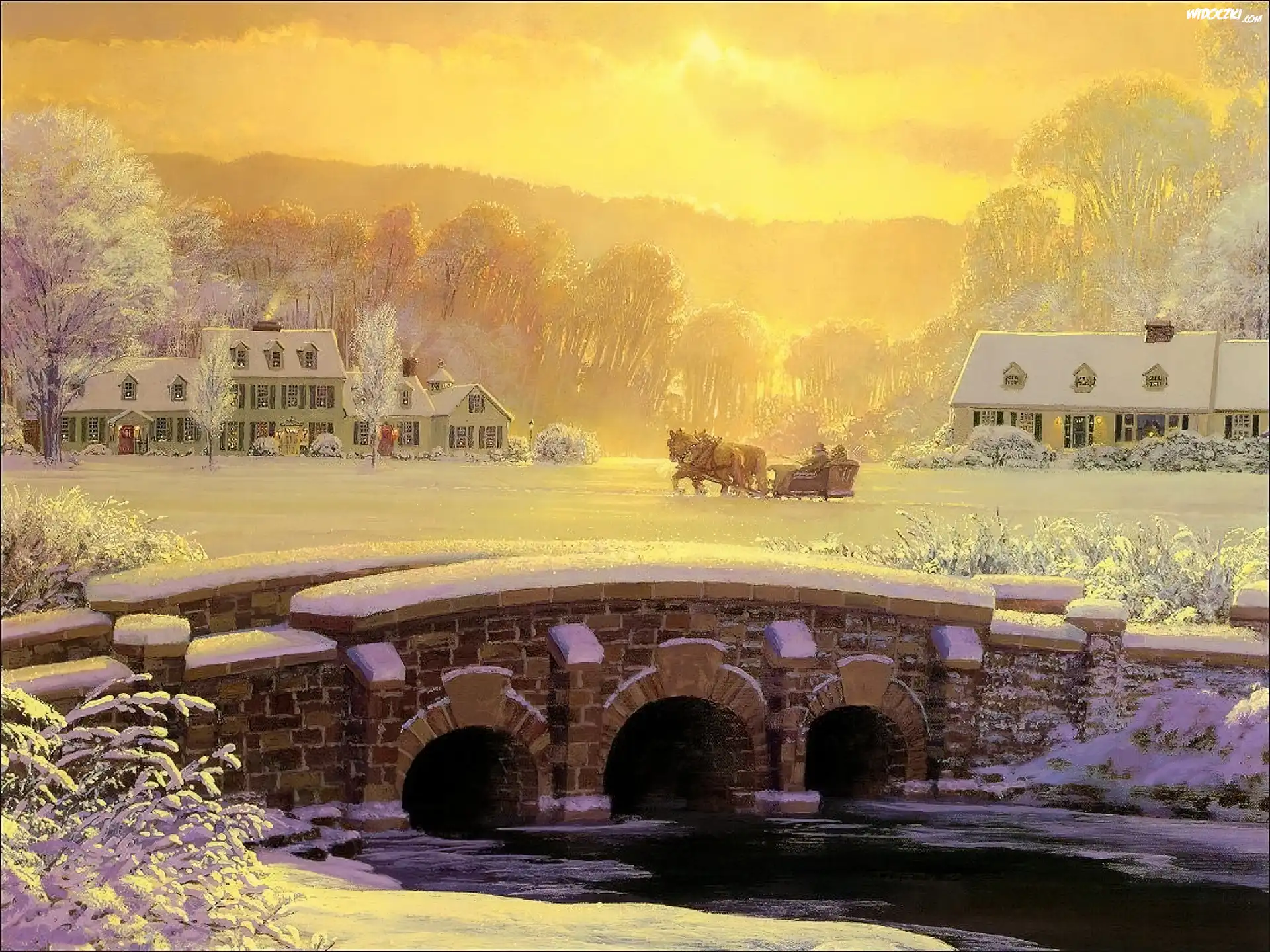 Zima, Konie, Sanna, Mostek, Obraz