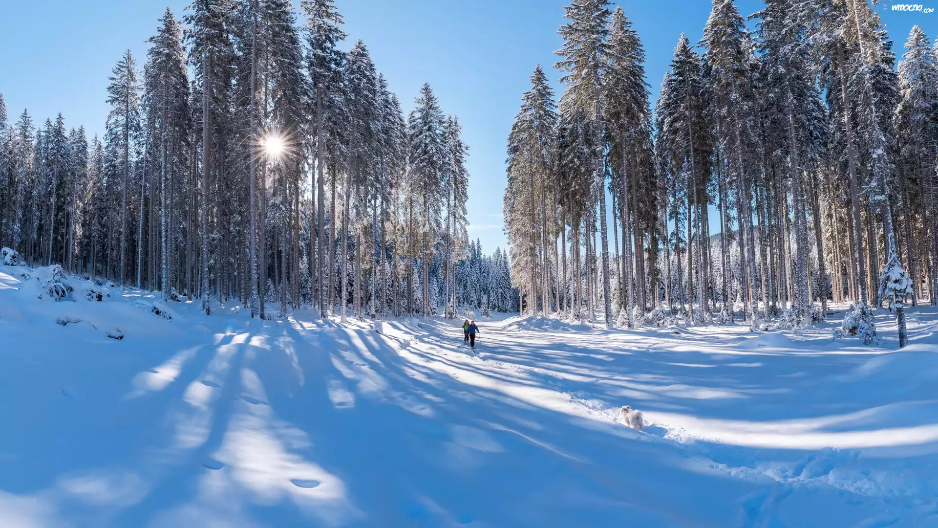 Zdjęcia, Zima, Drzewa, Promienie słońca, Narciarze, Pies