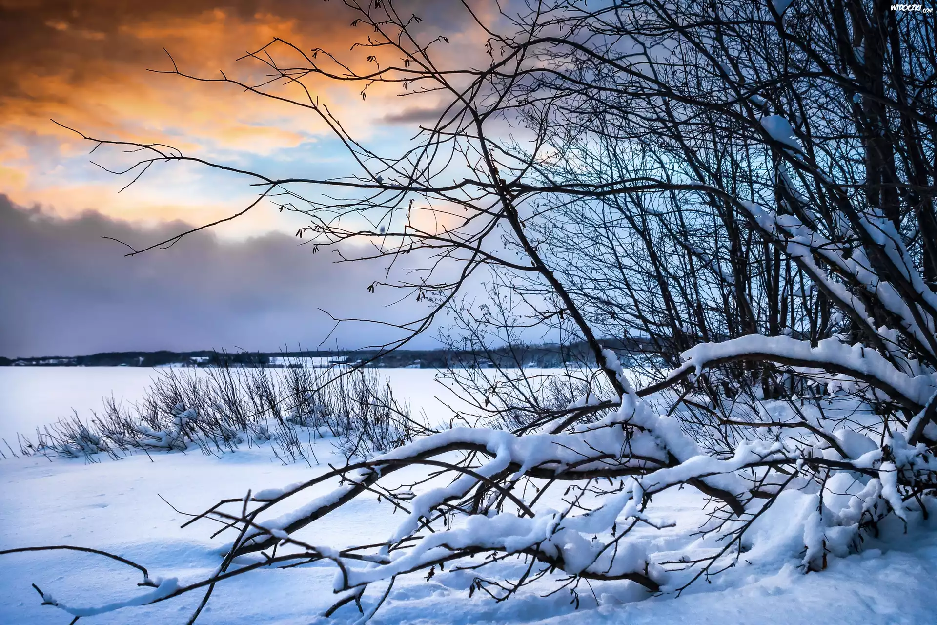 Zima, Drzewa, Pole, Gałęzie, Śnieg, Chmury, Niebo, Zachód słońca