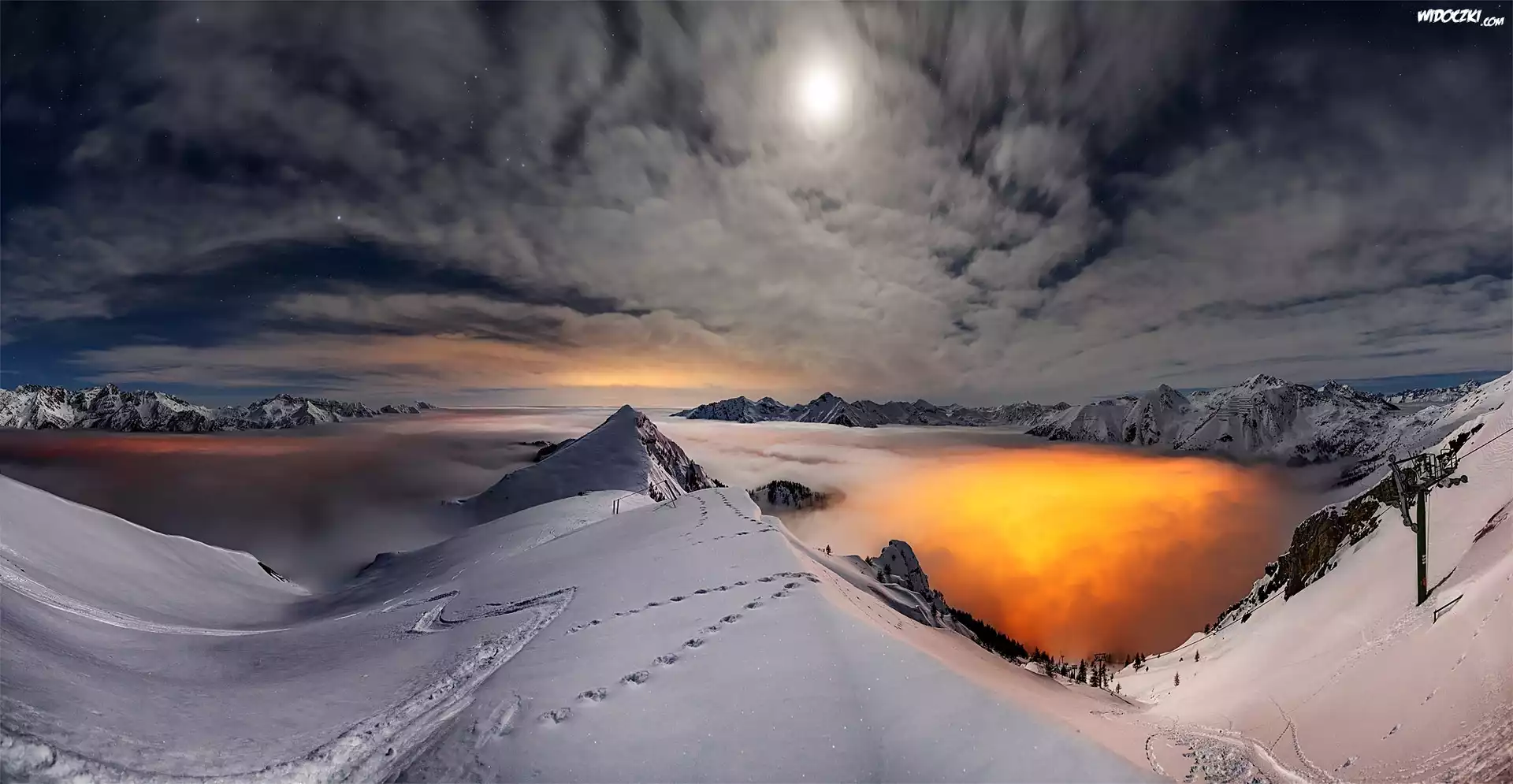 Zdjęcia, Zima, Szczyty, Gór, Zachmurzone, Niebo, Noc