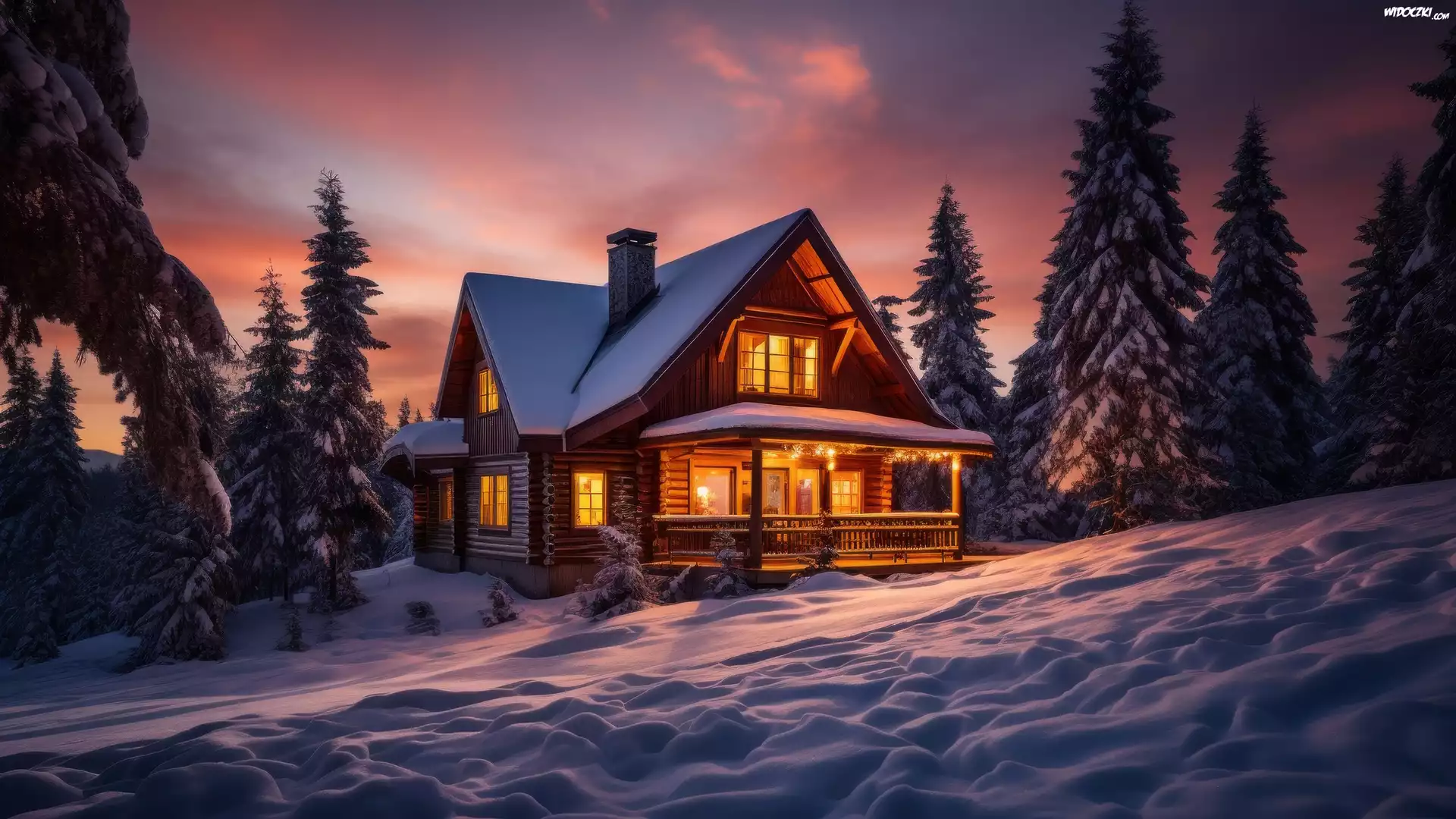 Zdjęcia, Zima, Las, Dom, Drzewa, Światła, Śnieg, Niebo, Wieczór, 2D