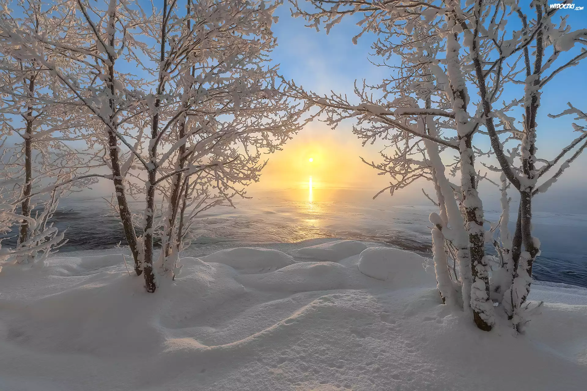 Zdjęcia, Zima, Drzewa, Śnieg, Rzeka, Lód, Zaspy, Niebo, Słoneczny blask
