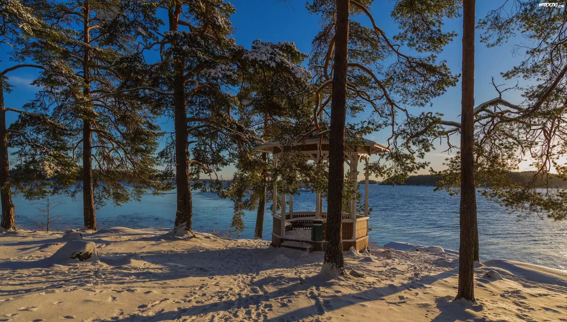 Zdjęcia, Zima, Finlandia, Drzewa, Altanka, Śnieg, Jezioro