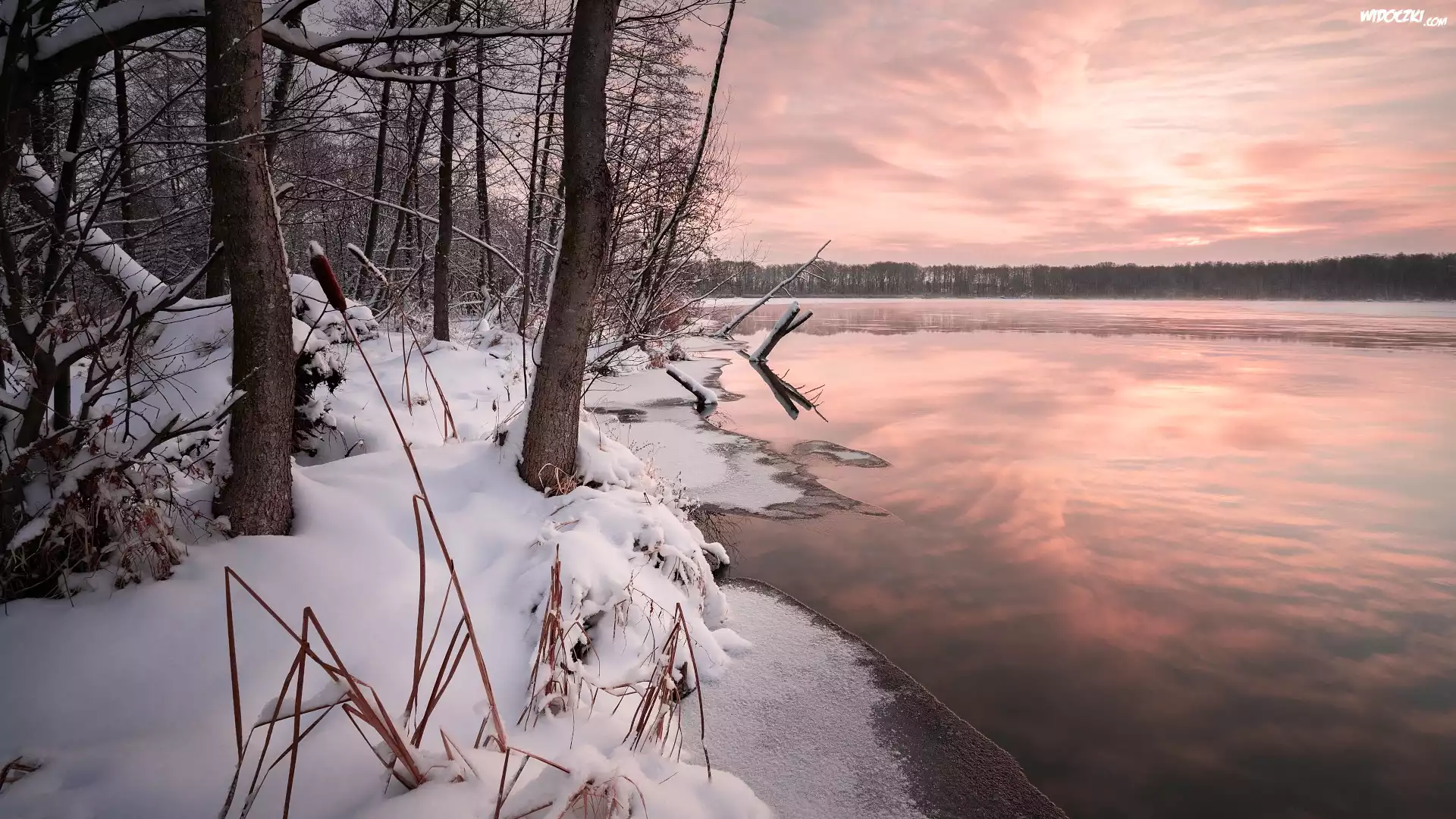 Zima, Las, Drzewa, Brzeg, Åšnieg, Jezioro