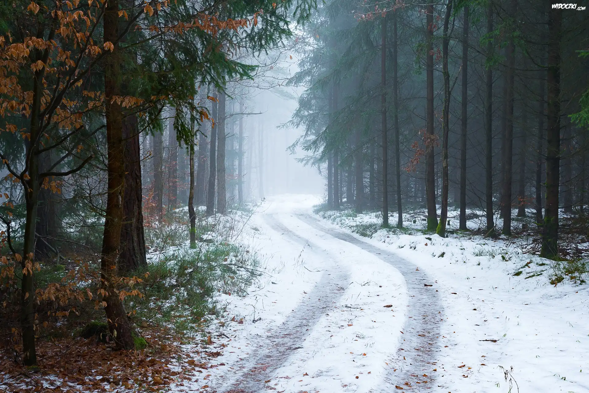 Zima, Las, Drzewa, Droga, Śnieg, Mgła