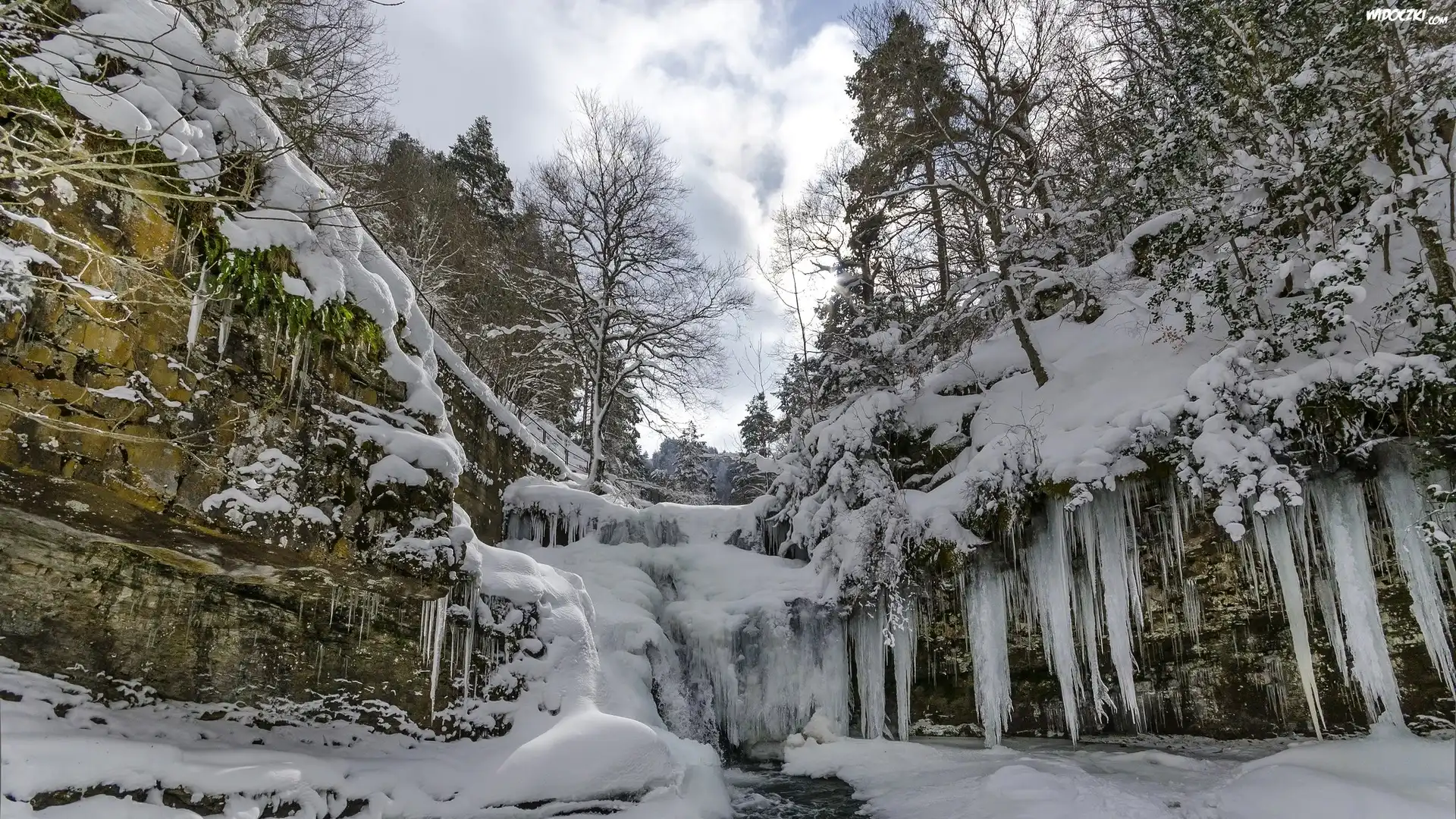 Zdjęcia, Zima, Skały, Drzewa, Śnieg, Sople