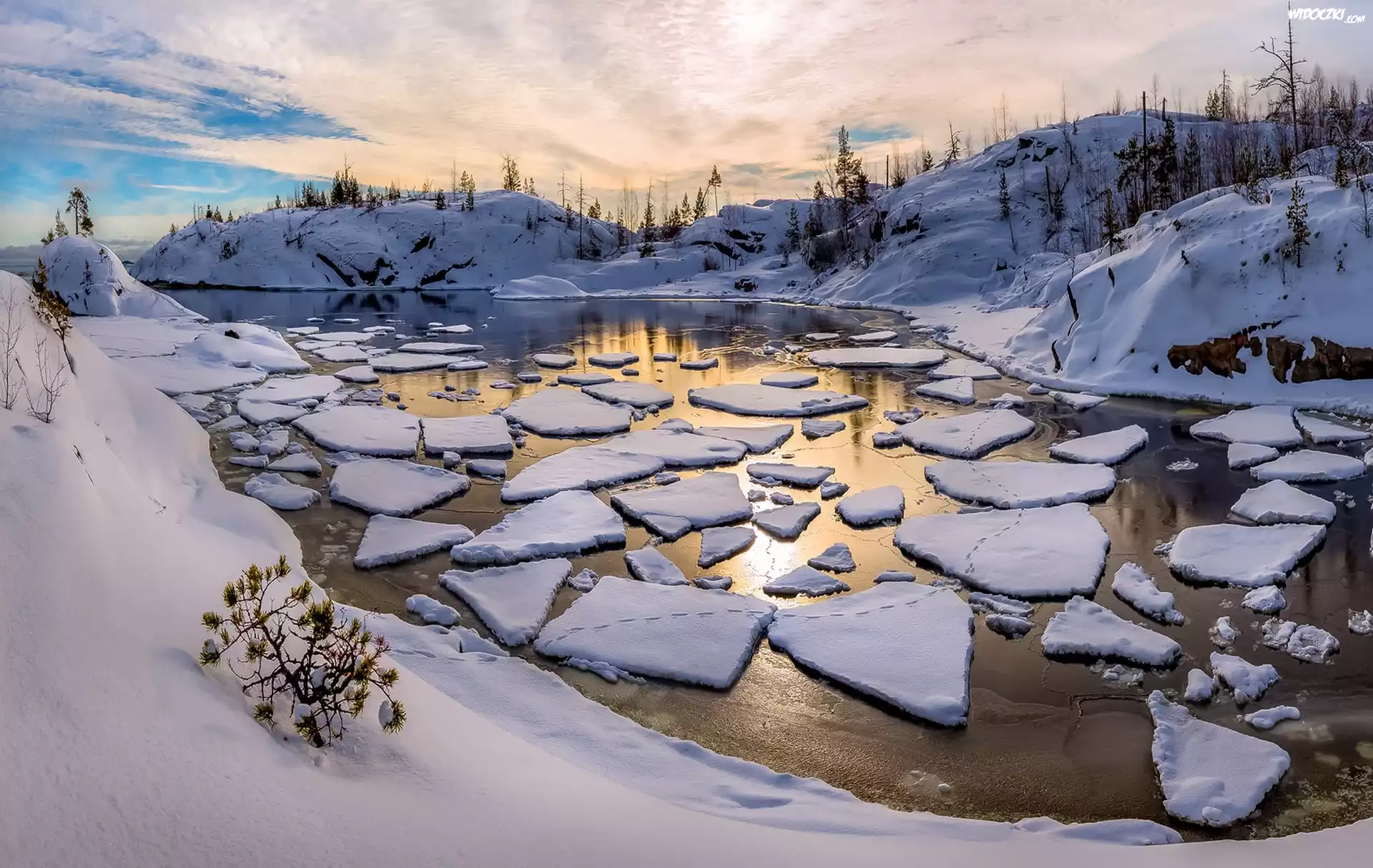 Zdjęcia, Zima, Jezioro, Kry, Śnieg, Pagórki