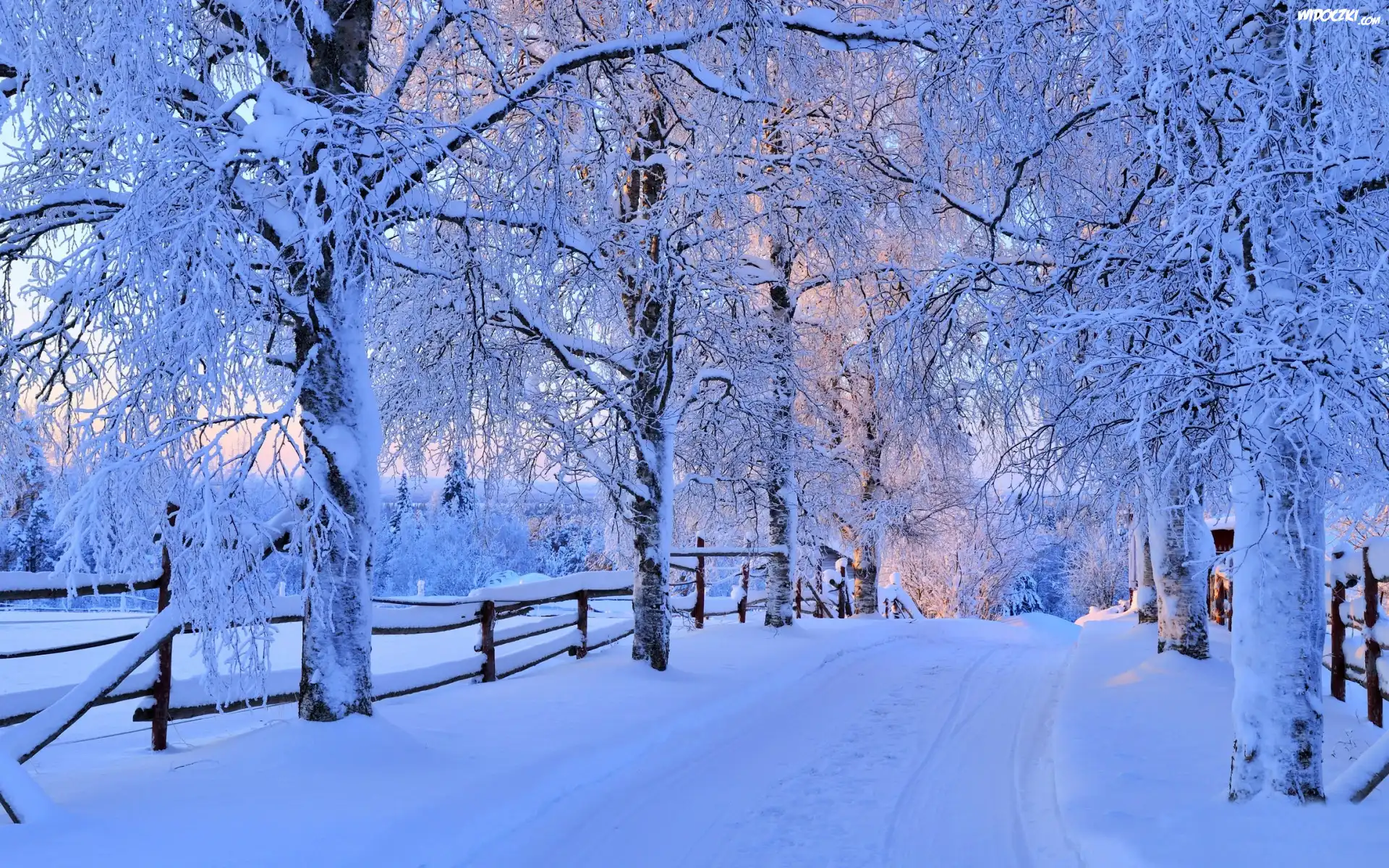 Zdjęcia, Zima, Droga, Ośnieżone, Drzewa, Śnieg, Ogrodzenie