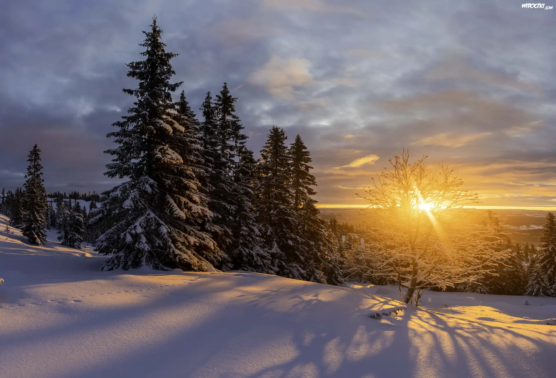 Zdjęcia, Zima, Zachód słońca, Drzewa, Śnieg, Chmury