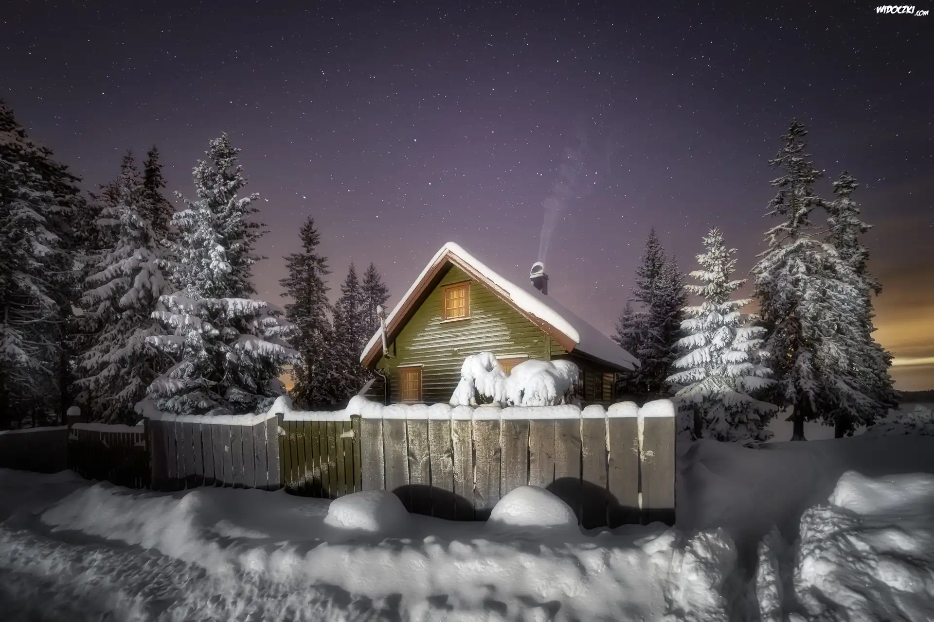 Zdjęcia, Zima, Dom, Noc, Drzewa