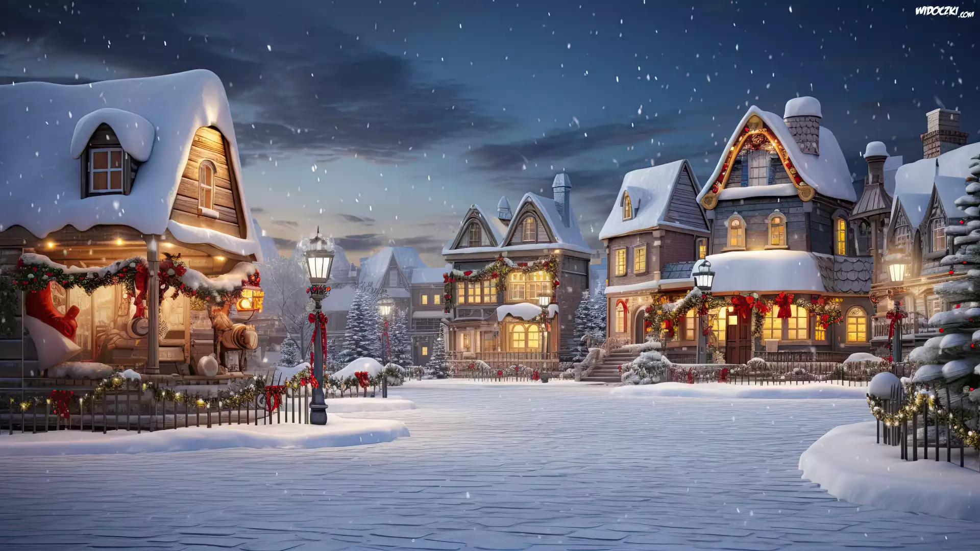 Zdjęcia, Zima, Miasto, Domy, Ulica, Choinka, Latarnie, Noc, Boże Narodzenie