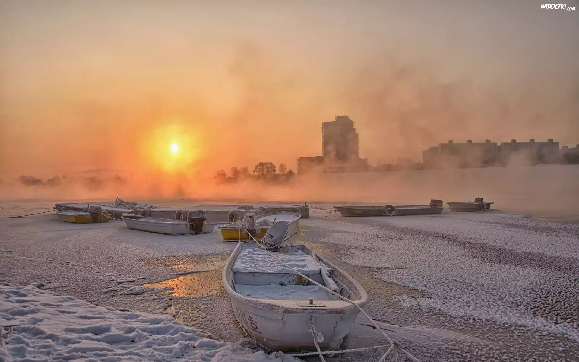 Zdjęcia, Zima, Lód, Śnieg, Łódki, Miasto