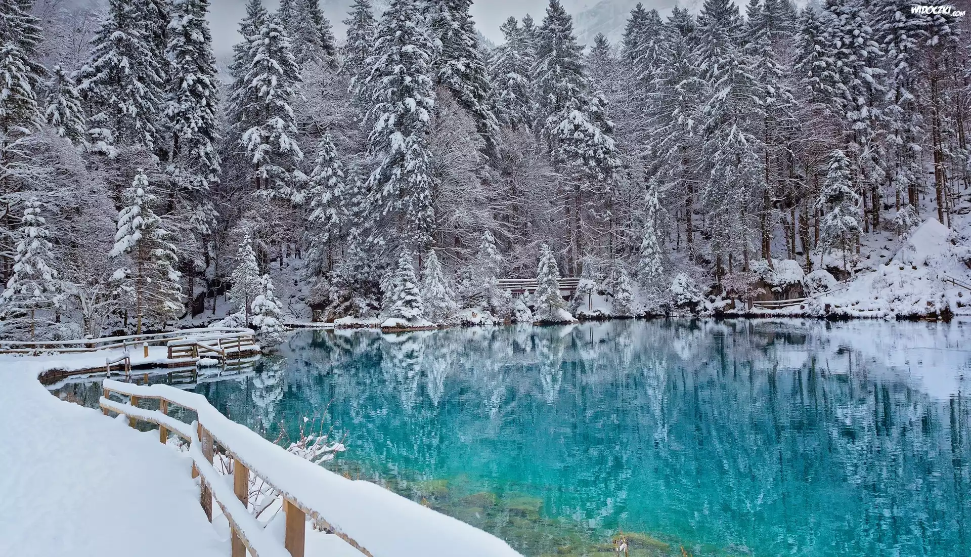 Zdjęcia, Zima, Jezioro, Las, Ogrodzenie, Śnieg