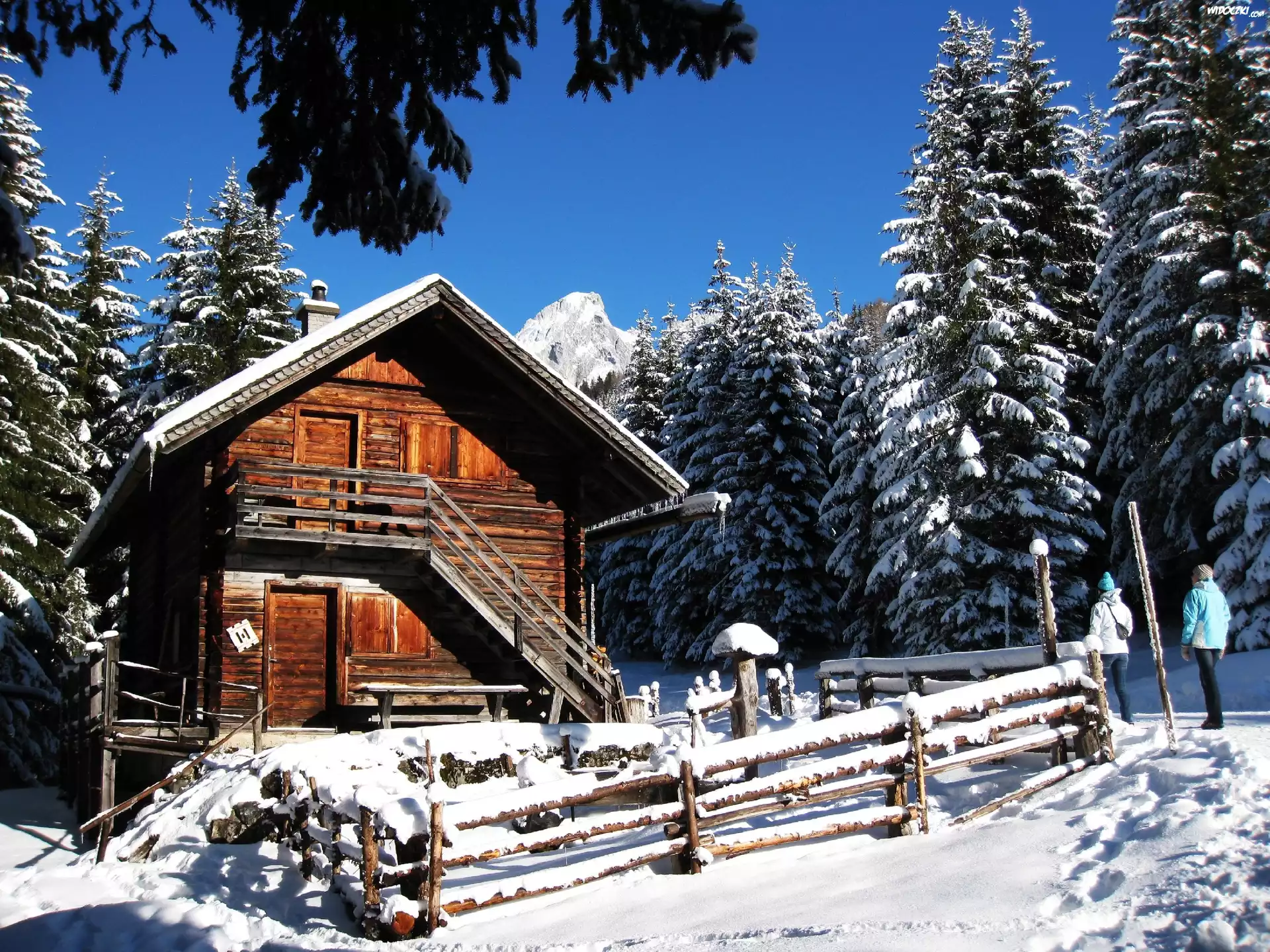 Zdjęcia, Zima, Drewniany, Dom, Ośnieżone, Iglaki