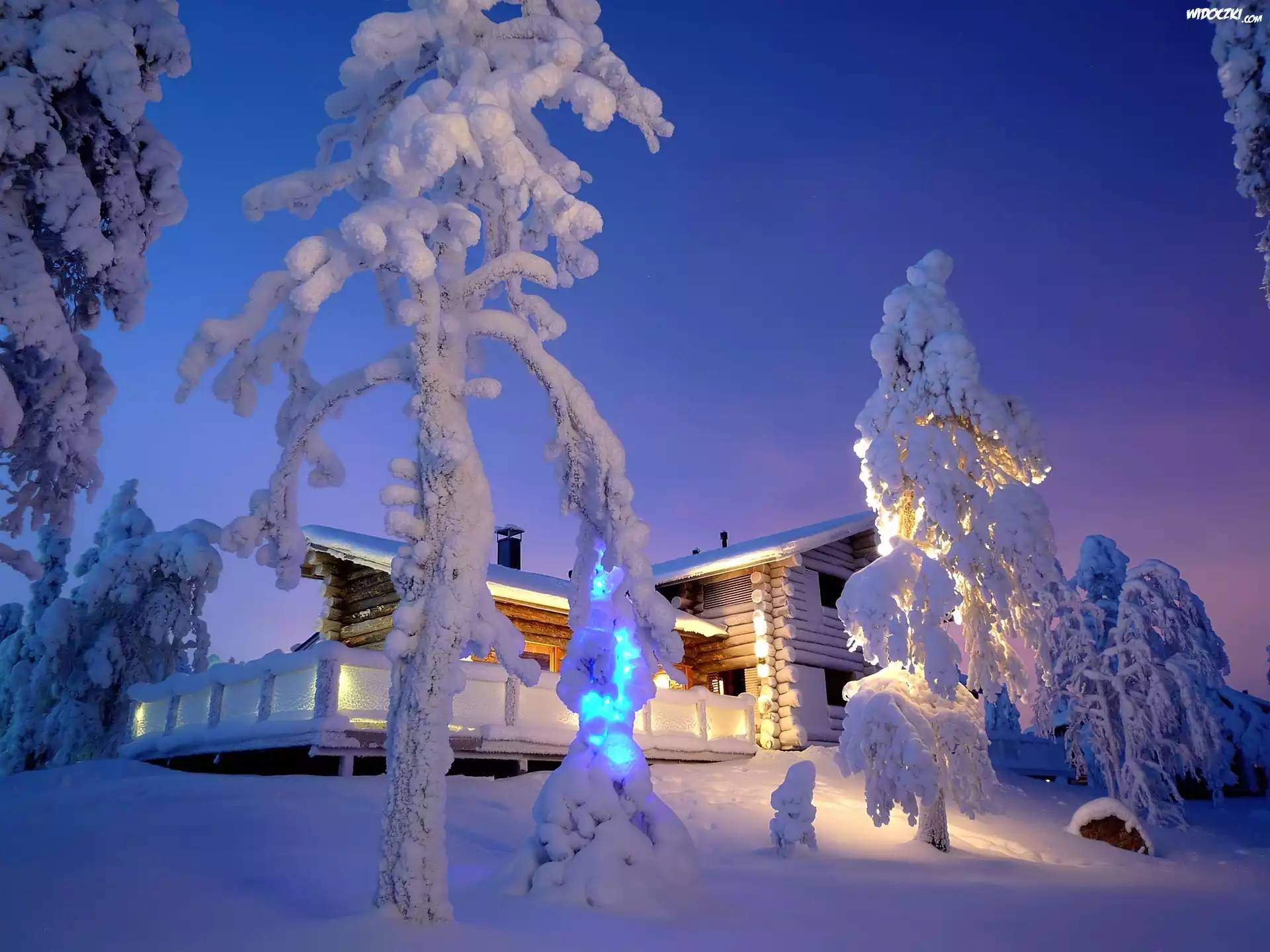 Zdjęcia, Zima, Oświetlony, Domek, Ośnieżone, Drzewa