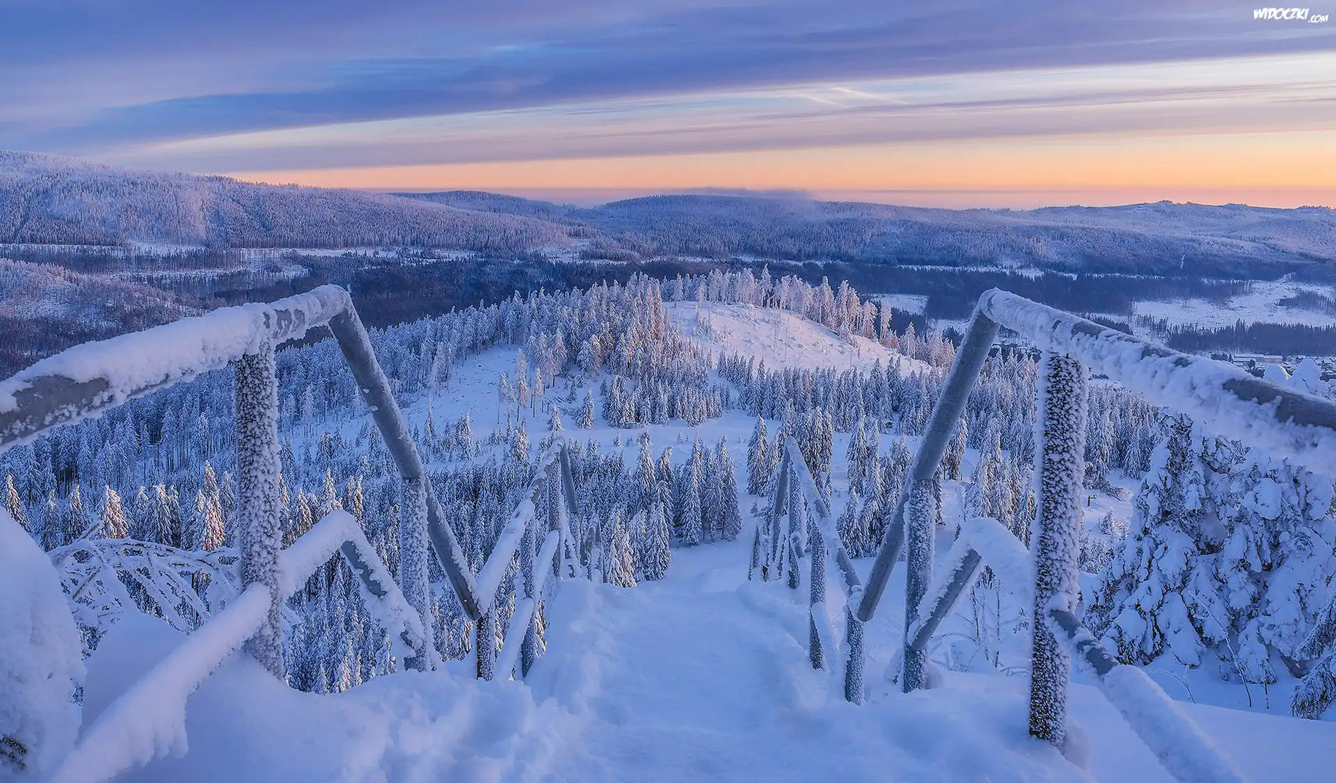 Zima, Śnieg, Lasy, Drzewa, Ośnieżone, Poręcze