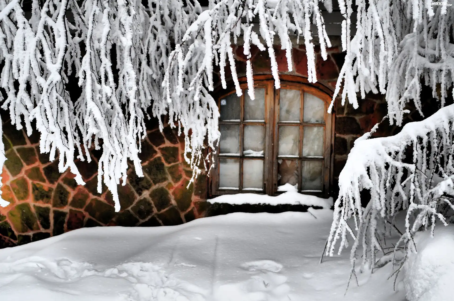 Zdjęcia, Zima, Dom, Okno, Ośnieżone, Gałązki
