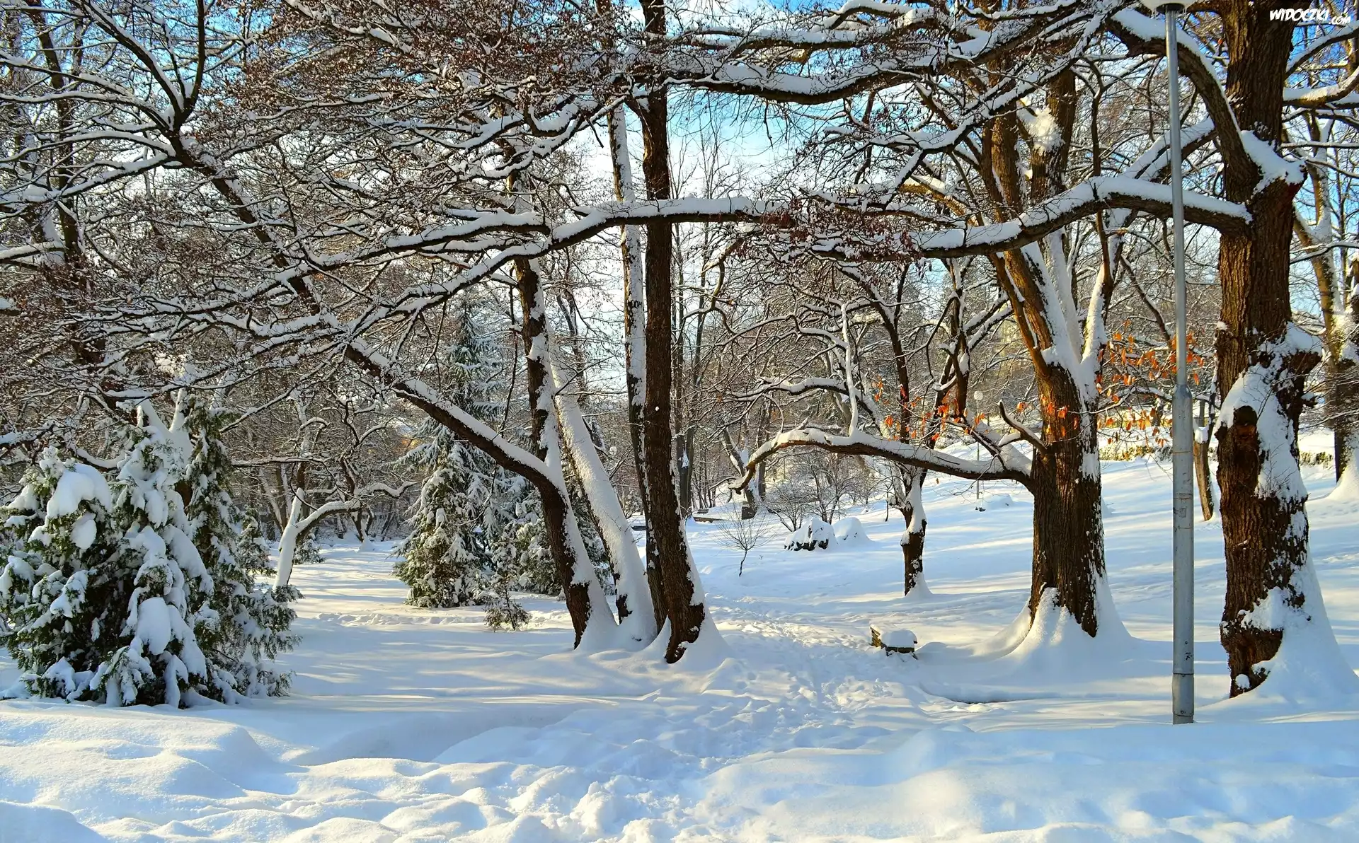 Zima, Śnieg, Park, Ośnieżone, Drzewa