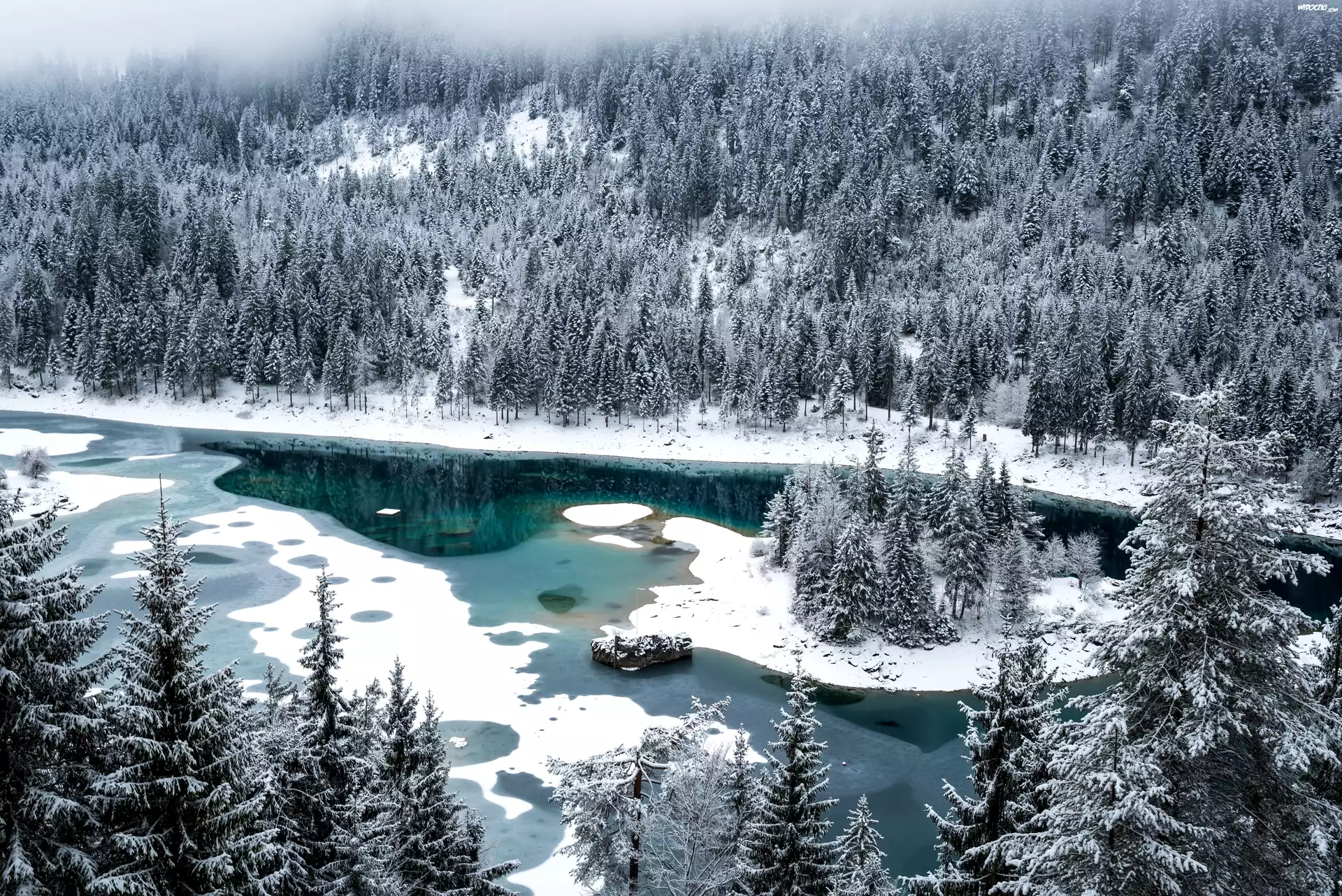 Zdjęcia, Zima, Rzeka, Ośnieżone, Świerki