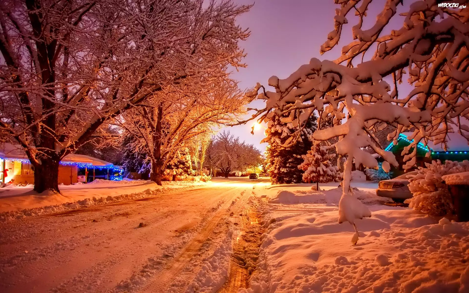 Zdjęcia, Zima, Droga, Zachód Słońca, Ośnieżone, Drzewa