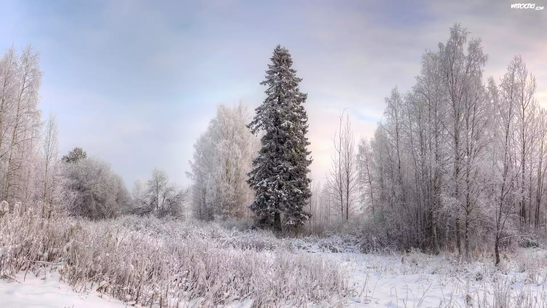 Zdjcia, Zima, Las, Drzewa, Oszronione, Trawy