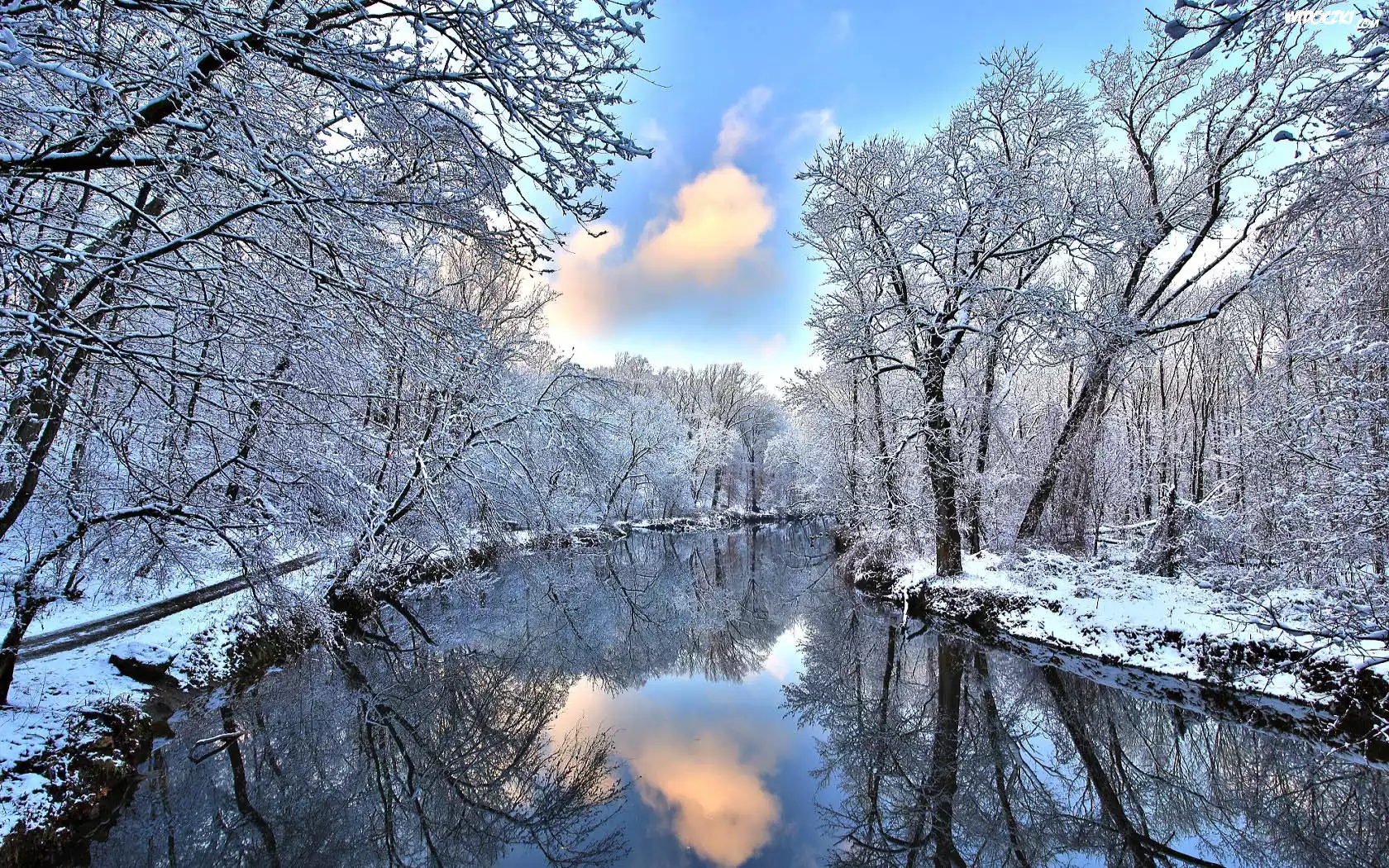 Zdjęcia, Zima, Rzeka, Oszronione, Drzewa