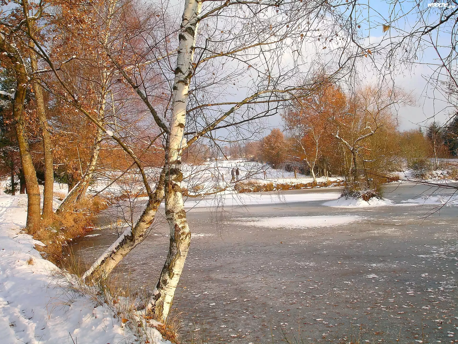 Zdjęcia, Zima, Zachód, Słońca, Park, Jezioro