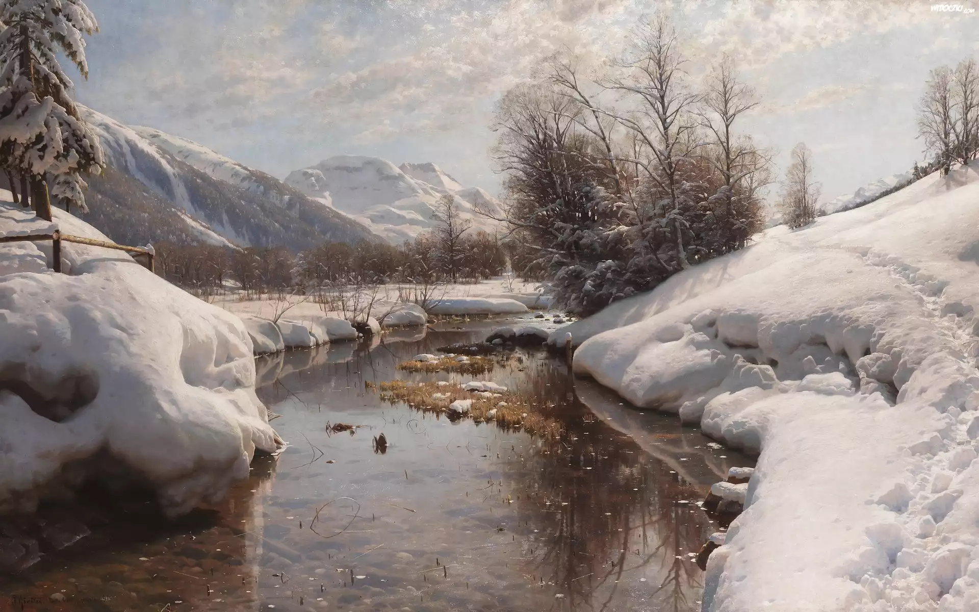 Zdjęcia, Malarstwo, Obraz, Peder Mork Monsted, Rzeka, Drzewa, Góry, Zima