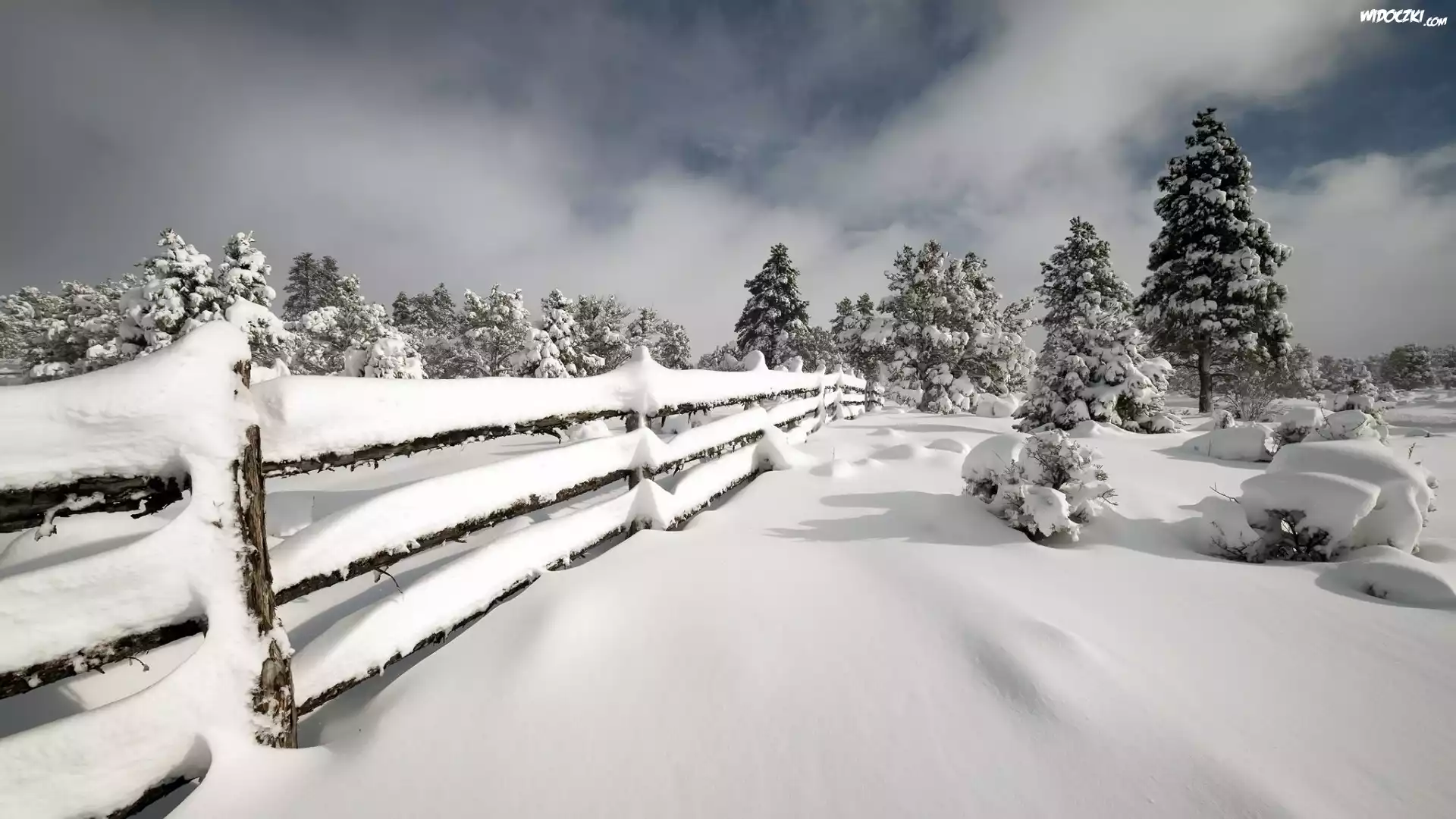 Zdjęcia, Zima, Śnieg, Iglaki, Płot, Drzewa