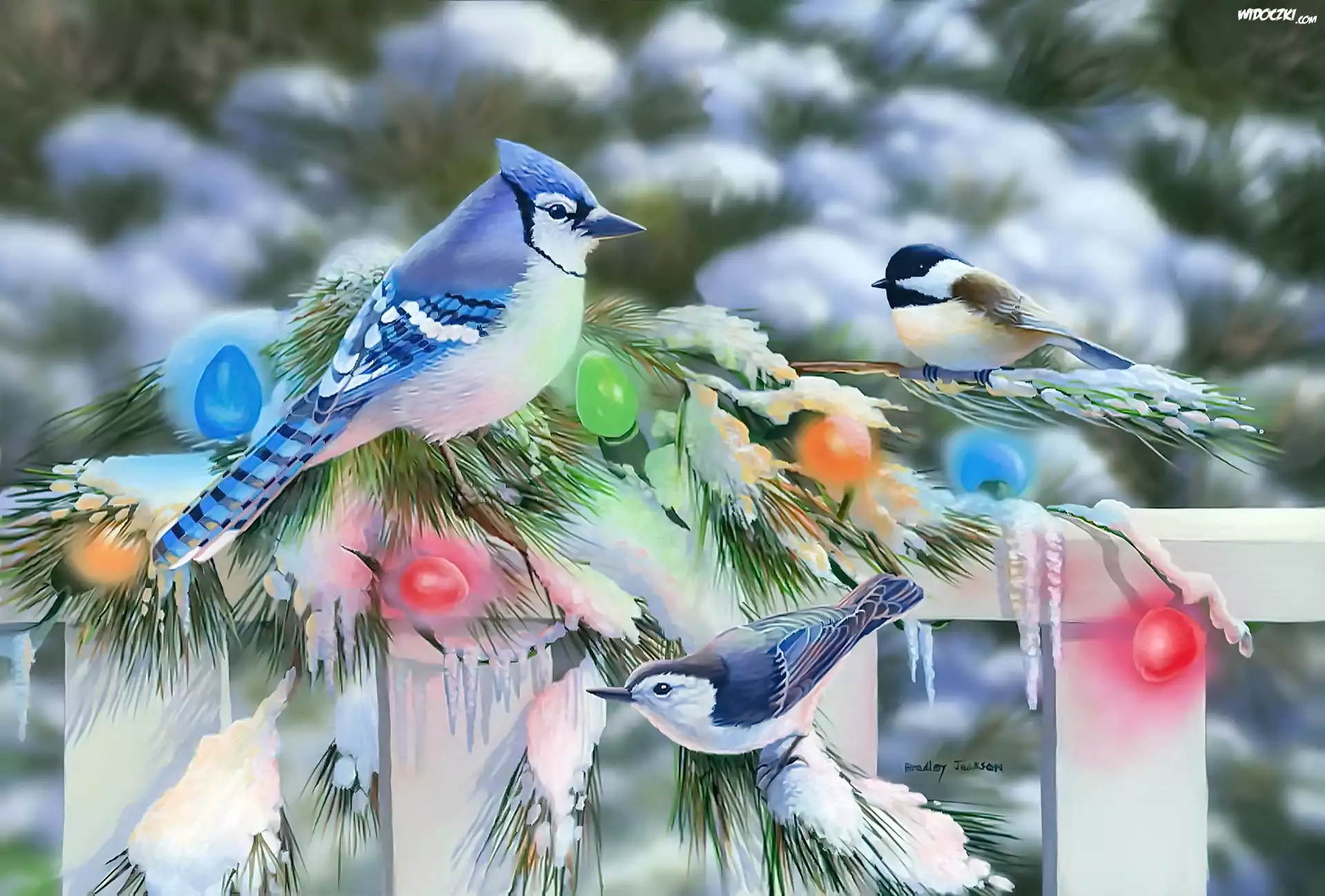Zdjęcia, Zima, Ptaki, Płot, Światełka