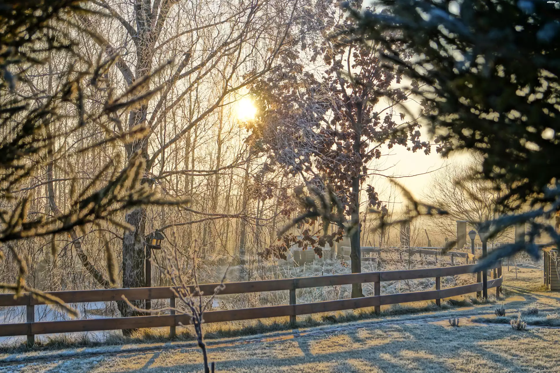 Zima, Drzewa, Płotek, Słońce