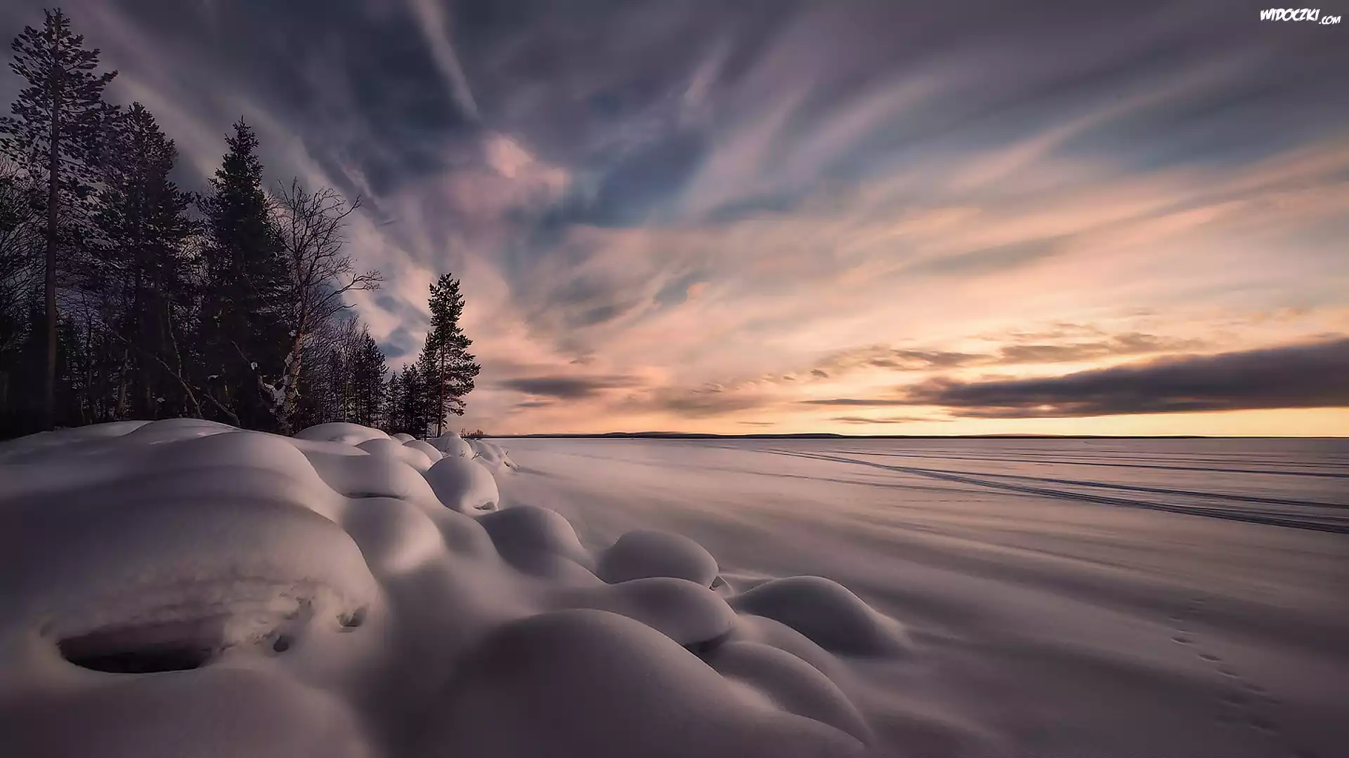 Zdjęcia, Zima, Śnieg, Zachód słońca, Pola, Drzewa