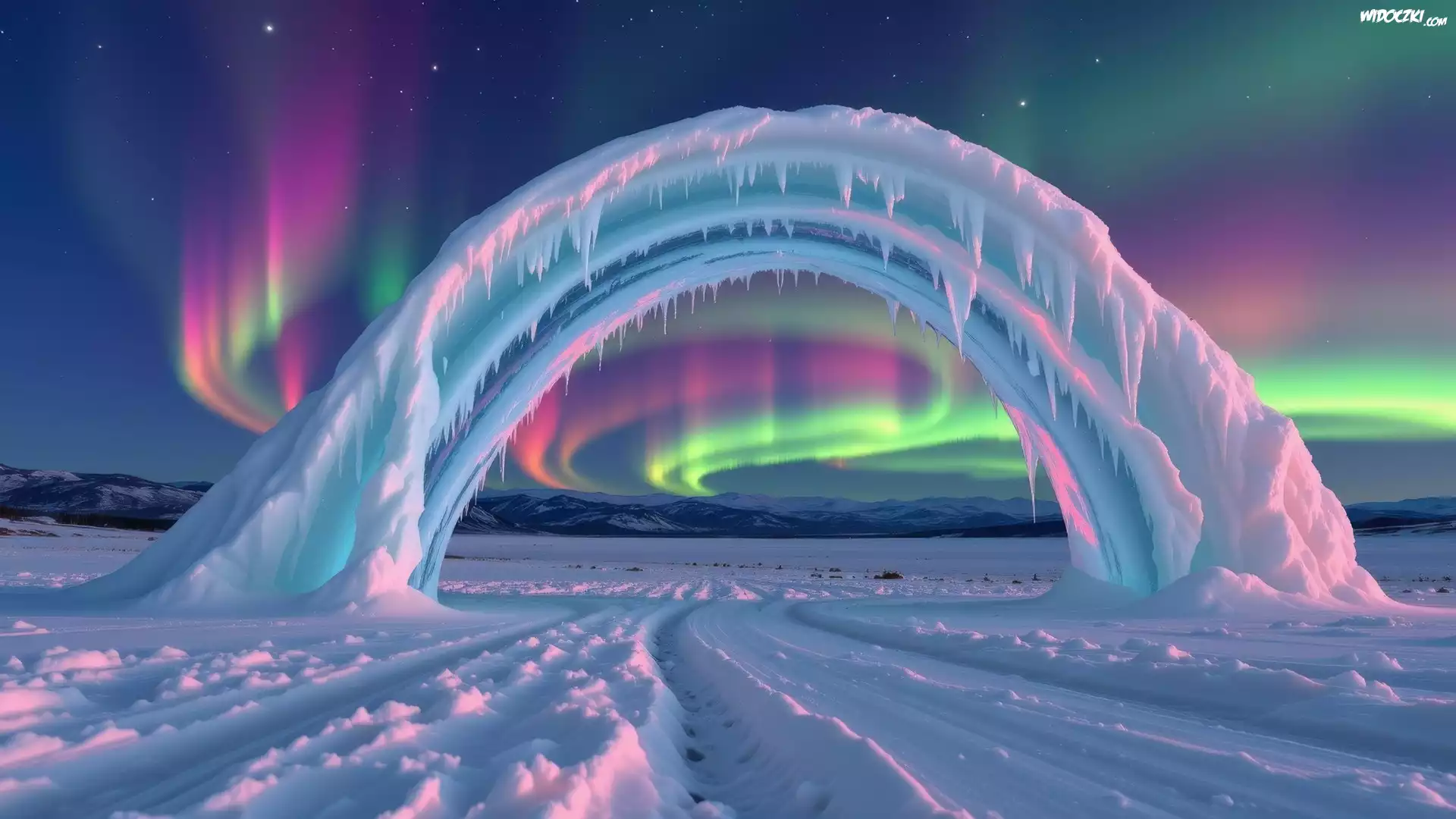 Zdjęcia, Zima, Oblodzony, Ośnieżony, Łuk, Sople, Zorza polarna, Śnieg, AI