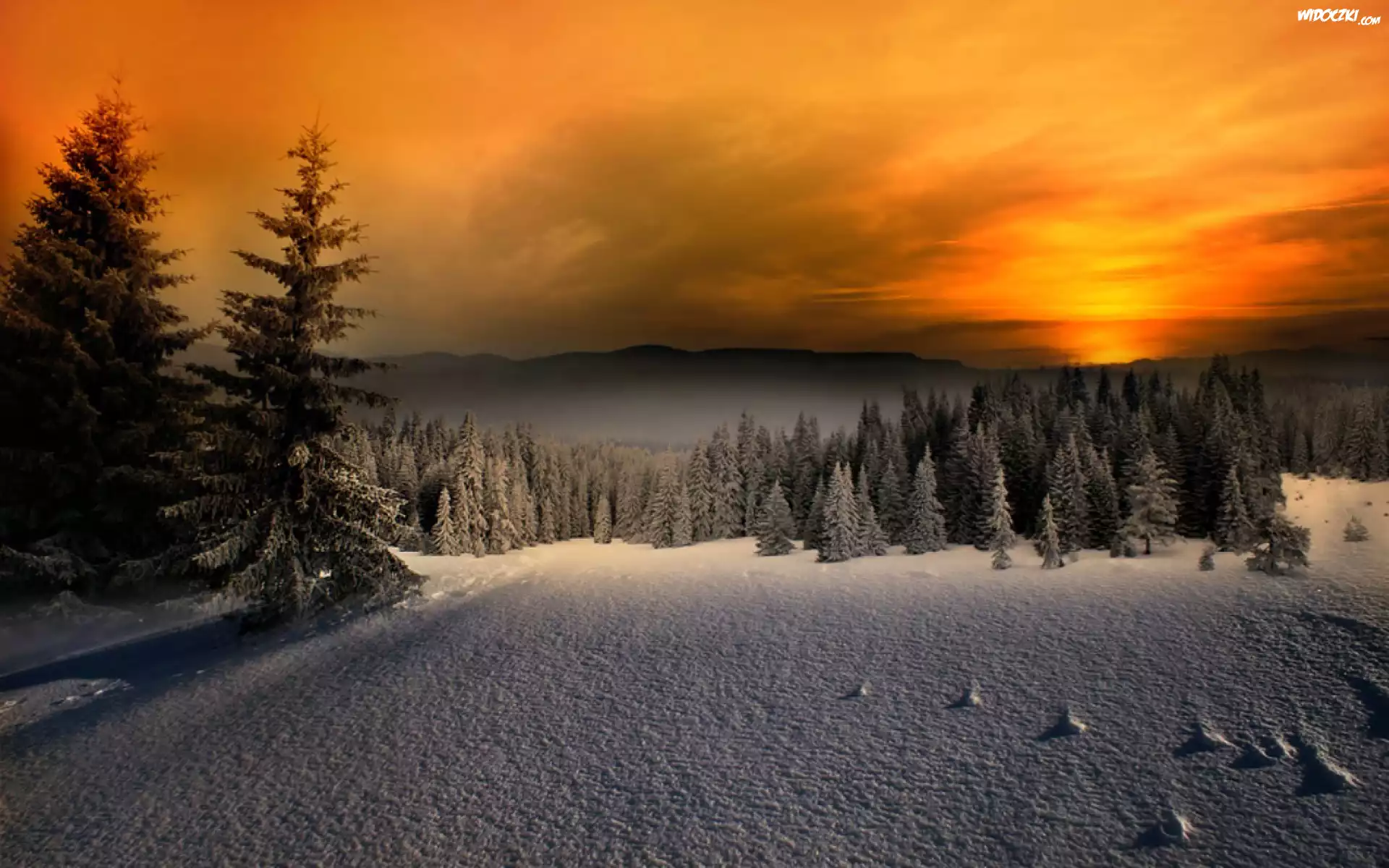 Zima, Śnieg, Choinki, Pomarańczowe, Niebo