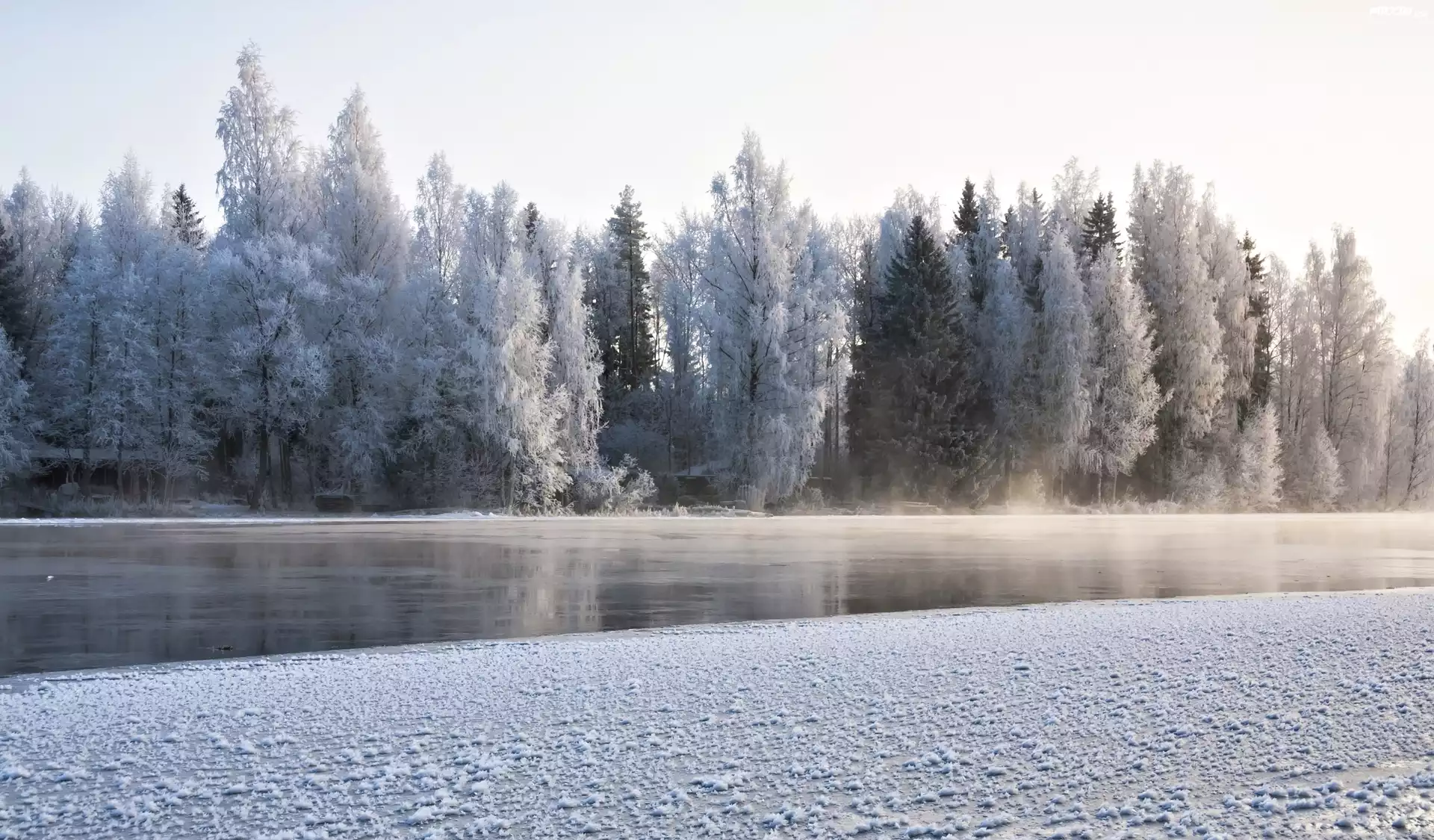 Zima, Rzeka, Drzewa, Poranek, Mgła