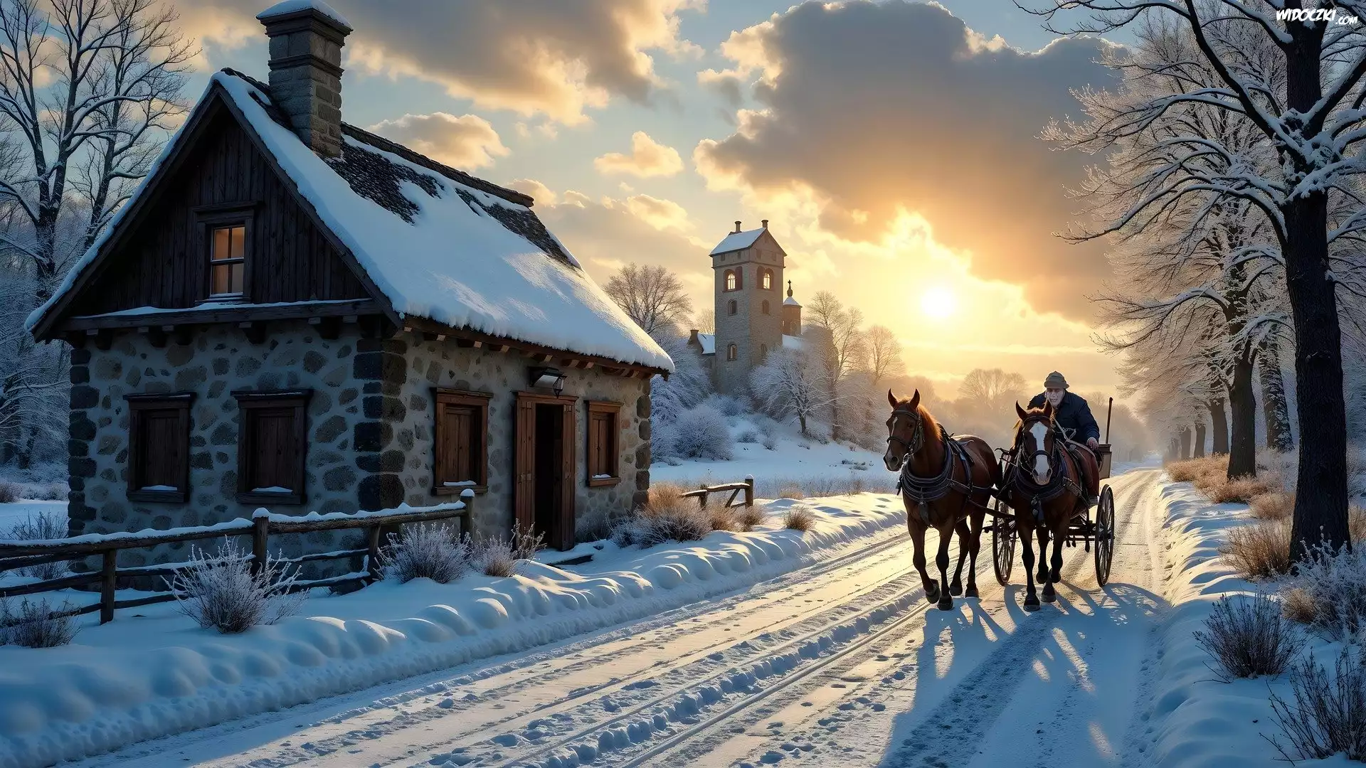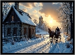 Zima, Dom, Droga, Drzewa, Konie, Bryczka, Powóz, Zachód słońca