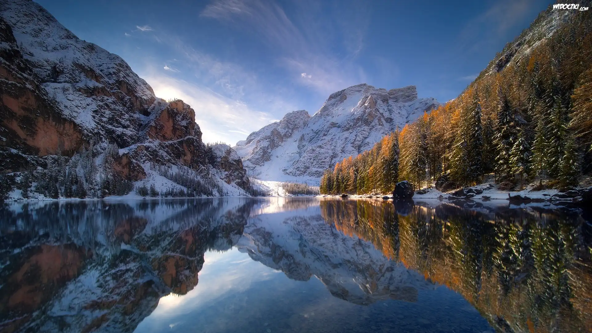 Włochy, Jezioro Pragser Wildsee, Góry Dolomity, Odbicie, Drzewa, Zima