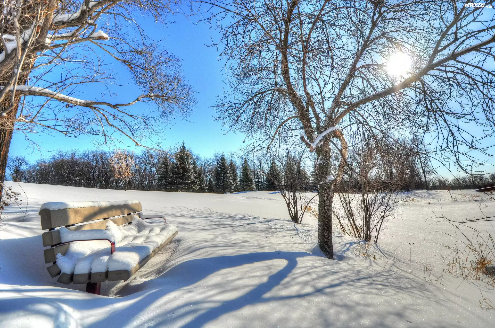 Zdjęcia, Zima, Park, Ławka, Drzewa, Promienie, Słońca