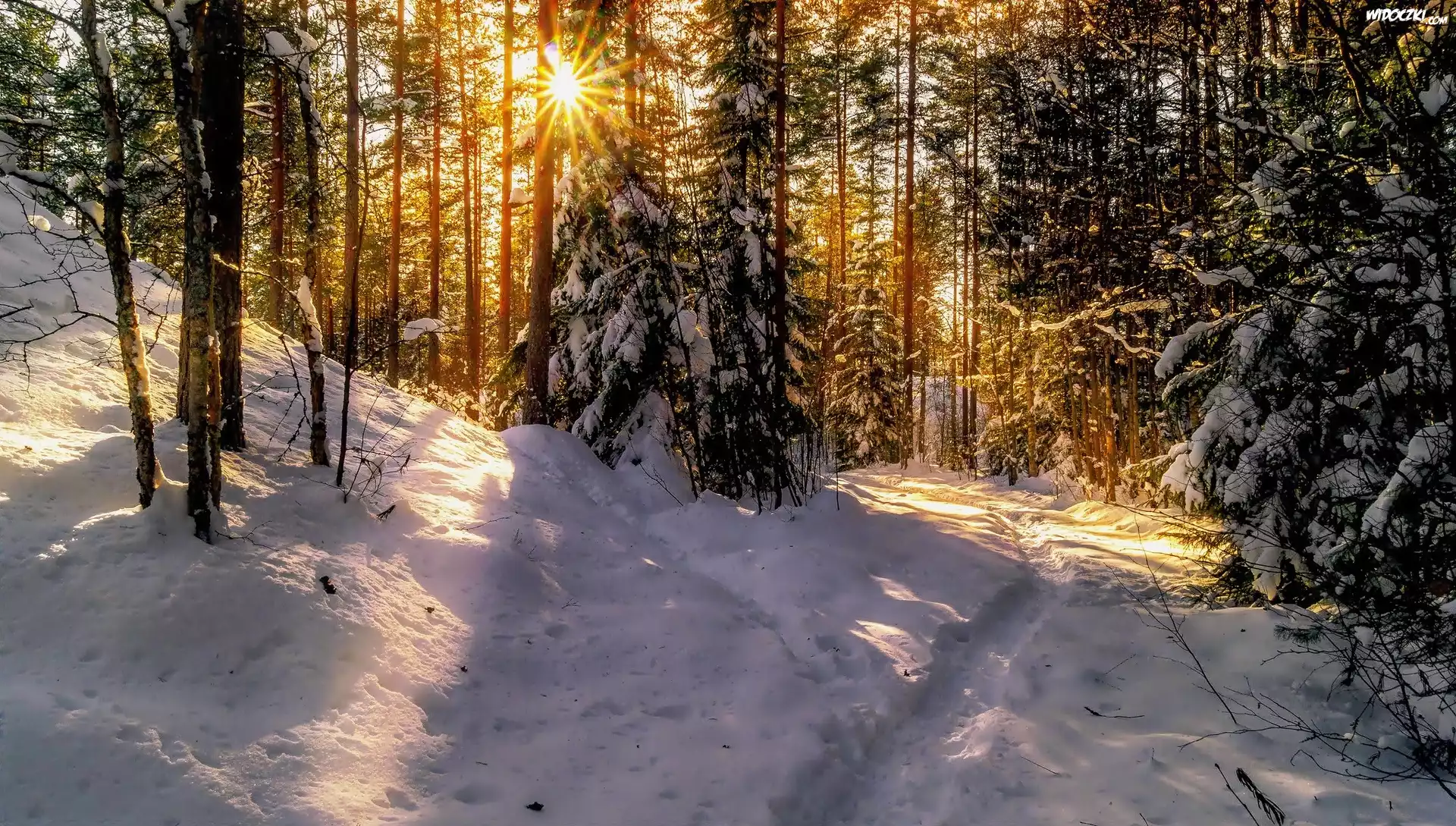Zdjęcia, Zima, Las, Ścieżka, Wschód, Promienie słońca