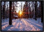 Zima, Śnieg, Ścieżka, Las, Drzewa, Dom, Promienie słońca, AI